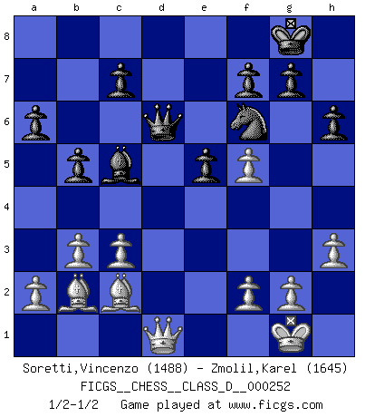 Last move : 1/2-1/2 2019 March 8 19:57:38 [Event "FICGS__CHESS__CLASS_D__000252"] [Site "FICGS"] [Date "2019.02.07"] [Round "1"] [White "Soretti,Vincenzo"] [Black "Zmolil,Karel"] [Result "1/2-1/2"] [WhiteElo "1488"] [BlackElo "1645"] 1.e4 e5 2.Nf3 Nc6 3.Bb5 a6 4.Ba4 Be7 5.c3 b5 6.Bc2 Nf6 7.d3 h6 8.O-O O-O 9.Re1 d6 10.Nbd2 Be6 11.d4 exd4 12.Nxd4 Bd7 13.N2f3 Ne5 14.Nxe5 dxe5 15.Nf3 Bd6 16.h3 Be6 17.Qe2 Qd7 18.Rd1 Qe7 19.Nh4 Qe8 20.Qe3 Nh5 21.Nf5 Bxf5 22.exf5 Qe7 23.b3 Nf6 24.Bb2 Rfe8 25.Be4 Rab8 26.Bc2 Bc5 27.Qe2 Rbd8 28.Rxd8 Rxd8 29.Rd1 Rxd1+ 30.Qxd1 Qd6 1/2-1/2 Ruy Lopez Kingside Castling by player White (move 8) Kingside Castling by player Black (move 8) This chess game ended in a draw. Follow this game move after move (download)The beauty of a move lies not in its' appearance but in the thought behind it. (Siegbert Tarrasch) Es ist peinlich, dass ich nie Weltmeister wurde. Es wäre leicht, Leonid Breschnjew als Ursache vorzuschieben, dessen Apparat den Vorzeigekommunisten Anatoli Karpow in allem unterstützte. Aber Garri Kasparow zum Beispiel, der ebenfalls von den Sowjets unerwünscht war, hat trotz der Widerstände den WM-Titel erobert. (Viktor Kortschnoi) Si no le temes a Spassky, entonces elimino el elemento del dinero. (Jim Slater) Seul un grand joueur sait à quel point il joue faiblement. (Xavier Tartacover) Fortune favours the audacious. (Desiderius Erasmus)