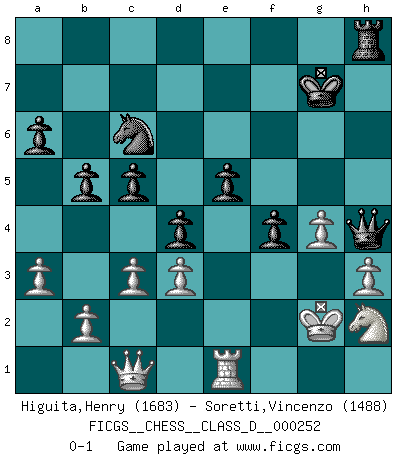 Last move : 0-1 2019 August 15 3:35:28 [Event "FICGS__CHESS__CLASS_D__000252"] [Site "FICGS"] [Date "2019.02.07"] [Round "1"] [White "Higuita,Henry"] [Black "Soretti,Vincenzo"] [Result "0-1"] [WhiteElo "1683"] [BlackElo "1488"] 1.e4 c5 2.Bc4 e6 3.Nc3 Nc6 4.Nf3 d6 5.Bb5 Nge7 6.O-O a6 7.Bxc6+ Nxc6 8.d3 Be7 9.h3 O-O 10.a3 b5 11.Ne2 e5 12.Ng3 f5 13.exf5 Bxf5 14.Nxf5 Rxf5 15.c3 Qf8 16.Nh2 Qf7 17.Qg4 h5 18.Qe4 d5 19.Qe2 Rf8 20.Bd2 Bg5 21.Bxg5 Rxg5 22.Kh1 Rf5 23.f3 g5 24.Rae1 Kg7 25.Qe3 Qe7 26.g4 hxg4 27.fxg4 Rf4 28.Kg1 d4 29.Qc1 Rh8 30.Rxf4 gxf4 31.Kg2 Qh4 0-1 This chess game has been lost on time (started : 2019.02.07 12:50:3) Sicilian defense Kingside Castling by player White (move 6) Kingside Castling by player Black (move 9) Player Black won this chess game. Follow this game move after move (download)The tactician knows what to do when there is something to do; whereas the strategian knows what to do when there is nothing to do. (Gerald Abrahams) Schach verlangt totale Konzentration. (Robert James Fischer) Me dio la sensación de como si yo estuviera jugando en contra del mismo Ajedrez. - al estar jugando en contra de Robert Fischer (Walter Shipman) Lorsque vous vous retrouvez devant une position atroce, ne tendez pas un ultime piège dérisoire avec l'intention d'abandonner si l'adversaire le déjoue ! Faites-vous plutôt un devoir de résister comme si votre vie en dépendait. Jouez le coup qui vous déplairait au centuple si vous étiez dans la peau de votre tortionnaire ! Is not life a hundred times too short to bore ourselves ? (Friedrich Nietzsche)
