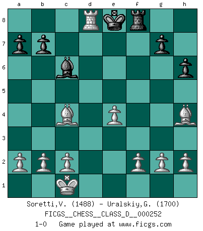 Last move : 1-0 2019 May 1 8:45:29 [Event "FICGS__CHESS__CLASS_D__000252"] [Site "FICGS"] [Date "2019.02.07"] [Round "1"] [White "Soretti,Vincenzo"] [Black "Uralskiy,Georgiy"] [Result "1-0"] [WhiteElo "1488"] [BlackElo "1700"] 1.e4 d6 2.d4 Nf6 3.Nc3 e5 4.dxe5 dxe5 5.Qxd8+ Kxd8 6.Nf3 Bd6 7.Bg5 Nbd7 8.O-O-O h6 9.Bh4 Ke7 10.Nd5+ Ke6 11.Bc4 Rb8 12.Nxf6 Ke7 13.Nxd7 Kxd7 14.Nxe5+ Ke8 15.Nxf7 Rf8 16.Nxd6+ cxd6 17.Rxd6 Bd7 18.Rhd1 Bc6 19.Rd8+ Rxd8 20.Rxd8+ 1-0 Pirc defense Queenside Castling by player White (move 8) Player White won this chess game. Follow this game move after move (download)Chess is in its essence a game, in its form an art, and in its execution a science. (Baron Tassilo) Schach wird sich dank seiner hohen kulturellen Tradition immer durchsetzen. In näherer Zukunft womöglich sogar als Gegenreaktion auf die maßlose Reizüberflutung im Freizeit- und Spielbereich. (Garry Kasparov) El Ajedrez es tortura mental. (Garry Kasparov) Vouloir jouer aux échecs contre soi-même est aussi paradoxal que vouloir marcher sur son ombre. (Stefan Zweig) Be who you are, and say what you feel because those who mind don't matter, and those who matter don't mind. (Dr Seuss)