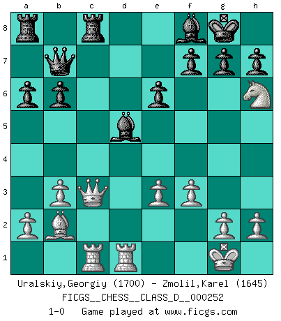 Last move : 1-0 2019 April 30 13:25:2 [Event "FICGS__CHESS__CLASS_D__000252"] [Site "FICGS"] [Date "2019.02.07"] [Round "1"] [White "Uralskiy,Georgiy"] [Black "Zmolil,Karel"] [Result "1-0"] [WhiteElo "1700"] [BlackElo "1645"] 1.b3 d5 2.Bb2 c5 3.e3 Nc6 4.Bb5 Bd7 5.Ne2 a6 6.Bxc6 Bxc6 7.d4 b6 8.O-O e6 9.Nd2 Nf6 10.c4 Be7 11.Rc1 O-O 12.Qc2 Bb7 13.dxc5 Bxc5 14.cxd5 Qxd5 15.Nf4 Qd7 16.Nc4 Be4 17.Qc3 Rfc8 18.Rfd1 Qc6 19.Ne5 Qb7 20.f3 Nd5 21.Nxd5 Bxd5 22.Ng4 Bf8 23.Nh6+ 1-0 Nimzovich-Larsen attack : Classical variation Kingside Castling by player White (move 8) Kingside Castling by player Black (move 11) Player White won this chess game. Follow this game move after move (download)Winning isn't everything... but losing is nothing. (Mednis) Du weisst es gibt ein Problem mit Computern und Fernschach, wenn jeder eine Rating von 2450 hat. (John Christen Knudsen) Aquel que teme a un Peón de Reina aislado, debería de retirarse del Ajedrez. (Siegbert Tarrasch) Il n'y a plus de joueurs du niveau de Jacob Murray dont la seule quête est le beau jeu, le plaisir de voir les pièces construire quelque chose. Sur 10 idées à la minute, 9 seront sans intérêt, la dernière s'avèrera géniale. (Christian Bauer) The various flowers seem good to different people. (Chinese proverb)