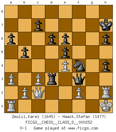 Last move : 0-1 2019 April 14 7:36:25 [Event "FICGS__CHESS__CLASS_D__000252"] [Site "FICGS"] [Date "2019.02.07"] [Round "1"] [White "Zmolil,Karel"] [Black "Haack,Stefan"] [Result "0-1"] [WhiteElo "1645"] [BlackElo "1477"] 1.e4 e5 2.Nf3 Nc6 3.Bb5 a6 4.Ba4 Nf6 5.d3 b5 6.Bb3 Be7 7.a3 O-O 8.O-O d6 9.h3 h6 10.Nc3 Be6 11.Nd5 Na5 12.Nxe7+ Qxe7 13.Bxe6 fxe6 14.Nh4 Kh7 15.Qe1 Nc6 16.Nf3 g5 17.Qd2 Nh5 18.h4 Rxf3 19.gxf3 Nd4 20.Qd1 Rf8 21.f4 Nxf4 22.Kh1 gxh4 23.c3 Nde2 24.Bxf4 Nxf4 25.Qd2 Qg5 26.Rg1 Qh5 27.Qe3 Ng6 28.Rg2 Rf3 29.Qd2 Nf4 30.Rh2 Rxd3 31.Qc2 Qf3+ 0-1 Ruy Lopez : Anderssen variation Kingside Castling by player Black (move 7) Kingside Castling by player White (move 8) Player Black won this chess game. Follow this game move after move (download)Later, I began to succeed in decisive games. Perhaps because I realized a very simple truth: not only was I worried, but also my opponent. (Mikhail Tal) Ich suche im Schach immer etwas Eigenes. Riskantes Spiel im Stile schachlicher Musketiere ist nicht meine Sache, auch wenn es vielen Freunden scharfer Wendungen gefällt. (Anatoly Karpov) Yo nunca en mi vida he jugado la Defensa Francesa, que viene siendo la más aburrida de todas las Aperturas. (Wilhelm Steinitz) Fischer est le meilleur joueur du monde et Karpov n'est qu'un joueur de bistrot. (Garry Kasparov, agé de 16 ans) A good book on your shelf is a friend that turns its back on you and remains a friend. (Author unknown)
