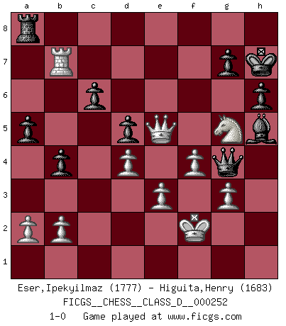 Last move : 1-0 2019 December 22 20:43:45 [Event "FICGS__CHESS__CLASS_D__000252"] [Site "FICGS"] [Date "2019.02.07"] [Round "1"] [White "Eser,Ipekyilmaz"] [Black "Higuita,Henry"] [Result "1-0"] [WhiteElo "1777"] [BlackElo "1683"] 1.g3 e5 2.d3 Bc5 3.c3 Qf6 4.e3 Nc6 5.Bg2 Nge7 6.Bxc6 Nxc6 7.d4 exd4 8.cxd4 Bb4+ 9.Bd2 Bxd2+ 10.Nxd2 d5 11.Qe2 O-O 12.Kf1 Re8 13.Qd3 Bf5 14.Qb3 Rab8 15.Ne2 Bh3+ 16.Kg1 Ne7 17.Nf4 Be6 18.Rc1 c6 19.h3 Bd7 20.h4 Ng6 21.Nxg6 fxg6 22.h5 gxh5 23.Rxh5 Kh8 24.Kg2 Rf8 25.f3 b5 26.Rch1 h6 27.R1h4 Be8 28.Re5 Bf7 29.Qa3 Ra8 30.Rf4 Qg6 31.Re7 a5 32.Kf2 Kg8 33.Rb7 b4 34.Qa4 Qe6 35.Rc7 Be8 36.Rxf8+ Kxf8 37.Qc2 Qd6 38.Qf5+ Kg8 39.Qe5 Qg6 40.Rb7 Kh7 41.f4 Qg4 42.Nf3 Bh5 43.Ng5+ 1-0 Benko's Opening Kingside Castling by player Black (move 11) Player White won this chess game. Follow this game move after move (download)If your opponent offers you a draw, try to work out why he thinks he's worse off. (Nigel Short) Capablanka war das größte Genie der Schachgeschichte! Aber denken sie nicht er habe nichts vom Schach verstanden. Er wusste nur soviel wie er wissen musste um seine Ziele zu erreichen. (Mikhail Moiseyevich Botvinik) Peones: ellos son el alma de esta partida, solos forman el ataque y la defensa. (Philidor) Aucun coup ne doit être joué sans but. (Pedro Damiano) Whenever people agree with me, I always feel I must be wrong. (Oscar Wilde)