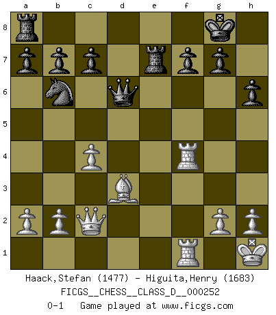 Last move : 0-1 2019 June 27 10:48:49 [Event "FICGS__CHESS__CLASS_D__000252"] [Site "FICGS"] [Date "2019.02.07"] [Round "1"] [White "Haack,Stefan"] [Black "Higuita,Henry"] [Result "0-1"] [WhiteElo "1477"] [BlackElo "1683"] 1.e4 e5 2.Nf3 Nc6 3.d4 exd4 4.Bc4 h6 5.Nxd4 Ne5 6.Be2 Nf6 7.O-O Be7 8.f4 Ng6 9.e5 Nd5 10.c4 Nb6 11.Nf5 O-O 12.Nc3 Bc5+ 13.Kh1 d6 14.Ng3 dxe5 15.Qc2 exf4 16.Nge4 Bf5 17.Bxf4 Re8 18.Bd3 Nxf4 19.Rxf4 Bxe4 20.Nxe4 Bd6 21.Nxd6 Qxd6 22.Raf1 Re7 0-1 Scotch gambit Kingside Castling by player White (move 7) Kingside Castling by player Black (move 11) Player Black won this chess game. Follow this game move after move (download)We must make sure that Chess will not be like a dead language, very interesting, but for a very small group. (Sytze Faber) Vielleicht wirkt die Aura früherer Spieler glanzvoller als die der heutigen Spieler, aber das liegt daran, dass man kein Programm wie Fritz hatte, das einem all die Löcher in ihren Partien zeigt. (Vladimir Kramnik) Puntos débiles o agujeros en la posición de tu oponente deben de ser ocupados por piezas, no Peones. (Siegbert Tarrasch) Les erreurs sont comme les malheurs, elles n'arrivent jamais seules. (Siegbert Tarrasch) Computers make it easier to do a lot of things, but most of the things they make it easier to do don't need to be done. (Andy Rooney)
