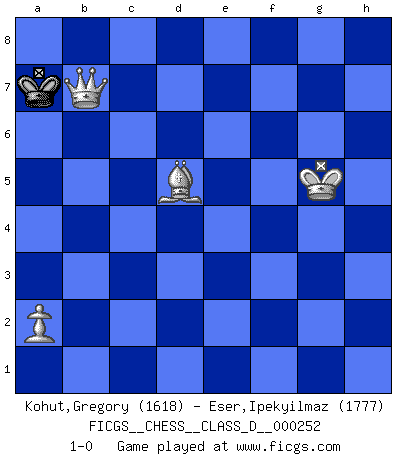 Last move : 1-0 2020 January 27 14:11:44 [Event "FICGS__CHESS__CLASS_D__000252"] [Site "FICGS"] [Date "2019.02.07"] [Round "1"] [White "Kohut,Gregory"] [Black "Eser,Ipekyilmaz"] [Result "1-0"] [WhiteElo "1618"] [BlackElo "1777"] 1.e4 g6 2.d4 d6 3.Nf3 Bg4 4.Bc4 e6 5.O-O d5 6.exd5 exd5 7.Re1+ Be7 8.Bb3 Qd6 9.h3 Bxf3 10.Qxf3 c6 11.Bf4 Qf6 12.c4 Nd7 13.cxd5 g5 14.dxc6 bxc6 15.Bh2 Qxf3 16.gxf3 Kf8 17.Nc3 Bb4 18.Rac1 Rc8 19.Red1 Bxc3 20.Rxc3 h6 21.Rdc1 Kg7 22.Rxc6 Ne7 23.Rxc8 Rxc8 24.Rxc8 Nxc8 25.Bc7 f6 26.f4 Ne7 27.Kg2 f5 28.fxg5 hxg5 29.f4 gxf4 30.Bxf4 Ng6 31.Bg5 Nf6 32.Bxf6+ Kxf6 33.Kg3 Kg5 34.d5 f4+ 35.Kf3 Nh4+ 36.Ke4 f3 37.Ke3 Kf6 38.Bd1 Nf5+ 39.Kxf3 a6 40.Kf4 a5 41.Bc2 Nd6 42.h4 Nc4 43.h5 Nxb2 44.d6 Nc4 45.d7 Ke7 46.h6 Nb6 47.h7 Nd5+ 48.Kg5 Kxd7 49.h8Q a4 50.Bxa4+ Kd6 51.Qd4 Ke6 52.Bb3 Kd6 53.Qxd5+ Kc7 54.Ba4 Kb6 55.Qc6+ Ka7 56.Bb3 Kb8 57.Bd5 Ka7 58.Qb7+ 1-0 Robatsch (Modern) defense Kingside Castling by player White (move 5) 10 pieces endgame at move 32 : White KBPPPP , Black KNPP WHITE : King + 1 Bishop 4 Pawns BLACK : King + 1 Knight 2 Pawns 9 pieces endgame at move 39 : White KBPPPP , Black KNP WHITE : King + 1 Bishop 4 Pawns BLACK : King + 1 Knight 1 Pawn 8 pieces endgame at move 43 : White KBPPP , Black KNP WHITE : King + 1 Bishop 3 Pawns BLACK : King + 1 Knight 1 Pawn 7 pieces endgame at move 48 : White KBPP , Black KNP WHITE : King + 1 Bishop 2 Pawns BLACK : King + 1 Knight 1 Pawn Promotion Queen by player White (move 49) 6 pieces endgame at move 50 : White KQBP , Black KN WHITE : King + 1 Queen 1 Bishop 1 Pawn BLACK : King + 1 Knight 5 pieces endgame at move 53 : White KQBP , Black K WHITE : King + 1 Queen 1 Bishop 1 Pawn BLACK : King + Player White won this chess game. Follow this game move after move (download)Life is like a game of Chess, changing with each move. (Chinese proverb) Die Leute spielen gegen mich seit 15 Jahren unter Ihren Möglichkeiten. (Robert James Fischer) Creo que una cierta cantidad de temperamento es esperada de los genios del Ajedrez. (Ron Gross) Que feriez-vous si vous étiez en train de jouer aux échecs et que la fin du monde arrive ? Je continuerais à jouer. (Saint Borromée) I would love to change the world, but they won't give me the source code. (Unknown)