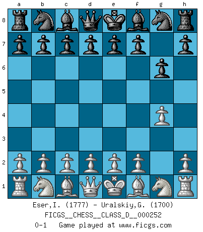 Last move : 0-1 2019 March 21 11:50:56 [Event "FICGS__CHESS__CLASS_D__000252"] [Site "FICGS"] [Date "2019.02.07"] [Round "1"] [White "Eser,Ipekyilmaz"] [Black "Uralskiy,Georgiy"] [Result "0-1"] [WhiteElo "1777"] [BlackElo "1700"] 1.g4 g6 0-1 This chess game has been lost on time (started : 2019.02.07 12:50:3) Grob's attack Player Black won this chess game. Follow this game move after move (download)One bad move nullifies forty good ones. (Horowitz) Kein Schachspieler kann gut schlafen. (H. G. Wells) Un jugador que es sorprendido, esta derrotado a medias. (Proverbio) Toutes les manuvres exécutées sur une colonne ouverte ont pour but ultime l'intrusion définitive sur la septième ou la huitième rangée, en plein cur de la position ennemie. (Aaron Nimzovitch) Those who make the worst use of their time are the first to complain of its brevity. (Jean de la Bruyere)
