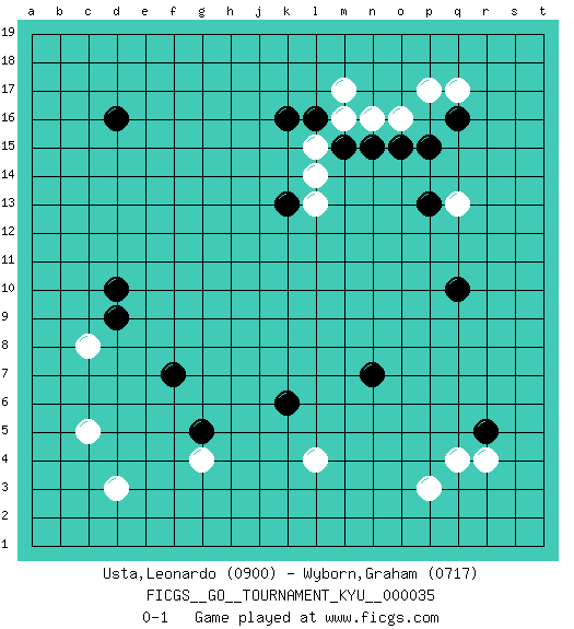 Last move : 0-1 2007 August 9 14:49:22 [Event "FICGS__GO__TOURNAMENT_KYU__000035"] [Site "FICGS"] [Date "2007.05.31"] [Round "1"] [Black "Usta,Leonardo"] [White "Wyborn,Graham"] [Result "0-1"] [Rating 1 "0900"] [Rating 2 "0717"] 1.k16 r4 2.q10 c5 3.d10 p3 4.k6 d3 5.f7 l4 6.n7 g4 7.g5 c8 8.d9 l14 9.m15 q17 10.q16 p17 11.o15 m17 12.r5 q4 13.d16 q13 14.p13 n16 15.n15 o16 16.p15 l15 17.l16 m16 18.k13 l13 0-1 This go game has been lost on time (started : 2007.05.31 20:28:1) Here are the names of the openings (joseki) played in the four corners : Corner q16 : l14 m15 This joseki is unknown. A weak or weird move has probably been played in this corner. Player White won this Go (weiqi, baduk) game. Follow this game move after move (download)Don't try to enclose an open skirt. (Anonymous) Cactus - It is depressed cucumber. (Ilmars Cirulis)