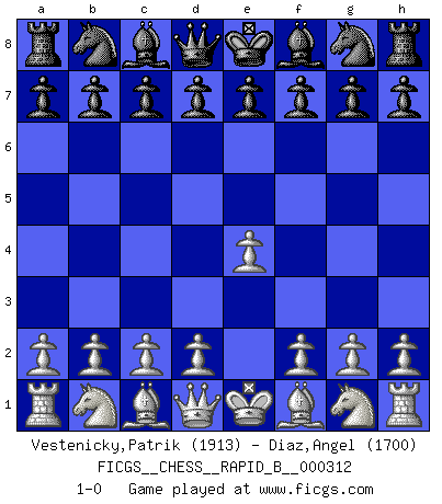 Last move : 1-0 2019 March 11 10:34:49 [Event "FICGS__CHESS__RAPID_B__000312"] [Site "FICGS"] [Date "2019.02.07"] [Round "1"] [White "Vestenicky,Patrik"] [Black "Diaz,Angel"] [Result "1-0"] [WhiteElo "1913"] [BlackElo "1700"] 1.e4 1-0 This chess game has been lost on time (started : 2019.02.07 18:15:53) King's pawn Opening Player White won this chess game. Follow this game move after move (download)Without error there can be no brilliancy. (Emanuel Lasker) Ich kämpfe solange mein Gegner einen Fehler machen kann. (Emanuel Lasker) Puntos débiles o agujeros en la posición de tu oponente deben de ser ocupados por piezas, no Peones. (Siegbert Tarrasch) Si le désir cupide (et stupide) de gagner est une inépuisable source de souffrance, une combinaison brillante sur l'échiquier est une découverte : le coquelicot qui s'épanouit lorsque apparaît la Voie Lactée. (Arrabal) Industry executives and analysts often mistakenly talk about strategy as if it were some kind of chess match. But in chess, you have just two opponents, each with identical resources, and with luck playing a minimal role. The real world is much more like a poker game, with multiple players trying to make the best of whatever hand fortune has dealt them. In our industry, Bill Gates owns the table until someone proves otherwise. (David Moschella, 'Computerworld')