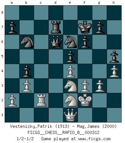 Last move : 1/2-1/2 2019 April 28 11:35:55 [Event "FICGS__CHESS__RAPID_B__000312"] [Site "FICGS"] [Date "2019.02.07"] [Round "1"] [White "Vestenicky,Patrik"] [Black "Mag,James"] [Result "1/2-1/2"] [WhiteElo "1913"] [BlackElo "2000"] 1.d4 Nf6 2.c4 e6 3.g3 d5 4.Bg2 Be7 5.e3 dxc4 6.Nd2 c5 7.Nxc4 O-O 8.Ne2 Qc7 9.dxc5 Na6 10.Bd2 Rd8 11.O-O e5 12.c6 b5 13.Na3 Rb8 14.Qe1 b4 15.Nc4 Be6 16.Rc1 Bd5 17.Bxd5 Rxd5 18.e4 Rc5 19.f3 Rxc6 20.b3 Nd7 21.Be3 Nb6 22.Nb2 Bc5 23.Nd1 Rd8 24.Bxc5 Rxc5 25.Ne3 f6 26.Kg2 Rd7 27.Rxc5 Qxc5 28.Nc1 Nc7 29.Rf2 Ne6 30.Rc2 Qd4 31.h4 h5 32.Kf2 Kf7 33.Ne2 Qd6 1/2-1/2 Catalan : Closed Kingside Castling by player Black (move 7) Kingside Castling by player White (move 11) This chess game ended in a draw. Follow this game move after move (download)Fischer sacrificed virtually everything most of us weakies (to use his term) value, respect, and cherish, for the sake of an artful, often beautiful board game, for the ambivalent privilege of being its greatest master. (Paul Kollar) Verschiedene, sehr schätzbare und im Laufe des Lebens nützliche Eigenschaften des Geistes können durch das Schachspiel erworben und gekräftigt werden, so dass sie zu Gewohnheiten werden, die uns nie im Stich lassen. (Benjamin Franklin) El Ajedrez es la vida. (Bobby Fischer) J'apprécie les joueurs d'est-indienne, c'est grâce à eux que je nourris ma famille depuis tant d'années. (Petrosian) I'll be back. (Arnold Schwarzenegger)