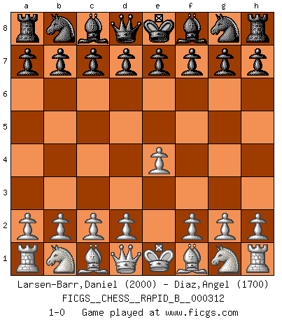 Last move : 1-0 2019 March 9 22:34:48 [Event "FICGS__CHESS__RAPID_B__000312"] [Site "FICGS"] [Date "2019.02.07"] [Round "1"] [White "Larsen-Barr,Daniel"] [Black "Diaz,Angel"] [Result "1-0"] [WhiteElo "2000"] [BlackElo "1700"] 1.e4 1-0 This chess game has been lost on time (started : 2019.02.07 18:15:53) King's pawn Opening Player White won this chess game. Follow this game move after move (download)If a ruler does not understand Chess, how can he rule over a kingdom ? (King Khusros II) Wer mein Gambit spielt, muß bereit sein, alle Brücken hinter sich abzubrechen. Es verändert den ganzen Menschen. Es wirkt wie ein Zauberstab und fördert verkümmerte, gute Charakter- eigenschaften wieder zu Tage. (Emil Joseph Diemer) La batalla por la última verdad nunca sera ganada. Y es por eso que el Ajedrez es tan fascinante. (Hans Kmoch) Les écrivains ont utilisé les échecs pour analyser les côtés extrêmes de la nature humaine. Dans ce cadre, les échecs offrent un champ d'expérimentation idéal. Mais on pourrait faire la même chose avec la peinture. Et là, en vous référant à Van Gogh, vous ne tirerez pas de conclusion définitive sur les peintres. (Gary Kasparov) Work expands to fill the time available. (C. Northcote Parkinson, in Parkinson's Laws)