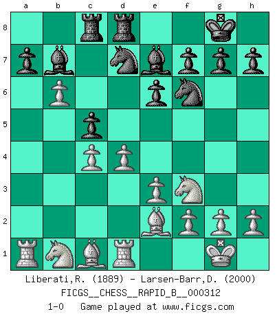 Last move : 1-0 2019 April 6 15:34:52 [Event "FICGS__CHESS__RAPID_B__000312"] [Site "FICGS"] [Date "2019.02.07"] [Round "1"] [White "Liberati,Riccardo"] [Black "Larsen-Barr,Daniel"] [Result "1-0"] [WhiteElo "1889"] [BlackElo "2000"] 1.d4 Nf6 2.b3 e6 3.Nf3 c5 4.e3 b6 5.Be2 d5 6.O-O Bb7 7.c4 dxc4 8.bxc4 Be7 9.Qa4+ Qd7 10.Qxd7+ Nbxd7 11.a4 O-O 12.Rd1 Rfd8 13.a5 Rac8 14.axb6 1-0 This chess game has been lost on time (started : 2019.02.07 18:15:53) Queen's pawn game Kingside Castling by player White (move 6) Kingside Castling by player Black (move 11) Player White won this chess game. Follow this game move after move (download)It is peculiar but a fact nevertheless, that gamblers in chess always have enthusiastic followers. (Botvinnik) Ich bin Weltmeister und muß mit niemandem irgend etwas diskutieren. (Viswanathan Anand) Ciertamente, de todas la drogas del mundo, el Ajedrez debe ser el mas placentero permamentemente. (Assiac) Les Echecs sont affaire de jugement sensible. Savoir quand frapper et quand esquiver. (Fischer) Warrior pose battles inner weakness and wins focus. You see that there is no war within you. You're on your own side, and you are your own strength. (Terri Guillemets)