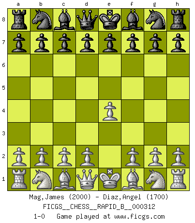 Last move : 1-0 2019 March 9 22:34:48 [Event "FICGS__CHESS__RAPID_B__000312"] [Site "FICGS"] [Date "2019.02.07"] [Round "1"] [White "Mag,James"] [Black "Diaz,Angel"] [Result "1-0"] [WhiteElo "2000"] [BlackElo "1700"] 1.e4 1-0 This chess game has been lost on time (started : 2019.02.07 18:15:53) King's pawn Opening Player White won this chess game. Follow this game move after move (download)I don't believe in psychology. I believe in good moves. (Bobby Fischer) Ich suche im Schach immer etwas Eigenes. Riskantes Spiel im Stile schachlicher Musketiere ist nicht meine Sache, auch wenn es vielen Freunden scharfer Wendungen gefällt. (Anatoly Karpov) Coloca el contenido de las piezas del Ajedrez en un sombrero, agitalo vigorosamente, arrojalas en un tablero desde una altura de 30 centimetros y así obtendras el estilo de Steinitz. (H. E. Bird) Les Echecs représentent une sphère d'idées créatrices basée sur la volonté des deux protagonistes. (Smyslov) Nobody is always a winner, and anybody who says he is, is either a liar or doesn't play poker. (Amarillo Slim)