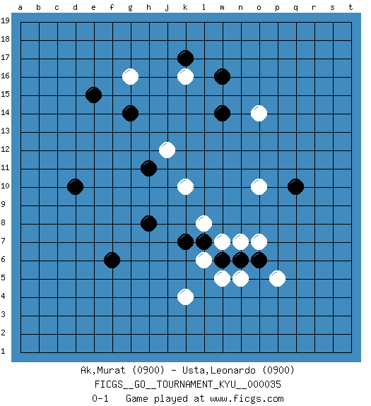 Last move : 0-1 2007 July 25 18:37:24 [Event "FICGS__GO__TOURNAMENT_KYU__000035 "] [Site "FICGS"] [Date "2007.05.31"] [Round "1"] [Black "Ak,Murat "] [White "Usta,Leonardo "] [Result "0-1"] [Rating 1 "0900"] [Rating 2 "0900"] 1.d10 k4 2.q10 k16 3.e15 p5 4.f6 o14 5.l7 g16 6.g14 k10 7.h11 j12 8.h8 l8 9.m14 o10 10.m16 l6 11.m6 m5 12.k17 m7 13.n6 n7 14.k7 n5 15.o6 o7 0-1 This go game has been lost on time (started : 2007.05.31 20:28:1) Here are the names of the openings (joseki) played in the four corners : Corner q4 : p5 l7Go-no-go (Wu~wu~) 5-5 Point. The 5-5 was experimented with briefly during the "New Fuseki" movement in Japan in the 1930s. The 5-5 point has not retained popularity because the 4-4 hoshi (star) point strikes a better balance between influence and territory. As one can see from the variations, though, the 5-5 is playable. Corner d16 : e15 g16Go-no-go (Wu~wu~) 5-5 Point. The 5-5 was experimented with briefly during the "New Fuseki" movement in Japan in the 1930s. The 5-5 point has not retained popularity because the 4-4 hoshi (star) point strikes a better balance between influence and territory. As one can see from the variations, though, the 5-5 is playable. Corner q16 : o14 m14This joseki is unknown. A weak or weird move has probably been played in this corner. Player White won this Go (weiqi, baduk) game.Follow this game move after move (download ) When your opponent is thick, you must also become thick. (Otake Hideo, 9p) Fame, I have already. Now I need the money. (an elderly Steinitz)