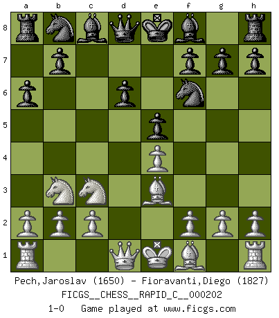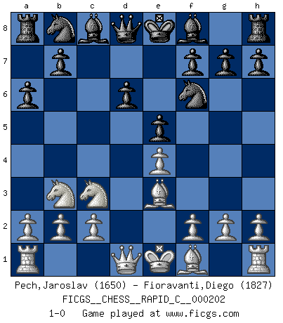 Last move : 1-0 2019 May 5 7:24:54 [Event "FICGS__CHESS__RAPID_C__000202"] [Site "FICGS"] [Date "2019.02.08"] [Round "1"] [White "Pech,Jaroslav"] [Black "Fioravanti,Diego"] [Result "1-0"] [WhiteElo "1650"] [BlackElo "1827"] 1.e4 c5 2.Nf3 d6 3.d4 cxd4 4.Nxd4 Nf6 5.Nc3 a6 6.Be3 e5 7.Nb3 1-0 This chess game has been lost on time (started : 2019.02.08 1:50:30) Sicilian : Najdorf, Byrne (English) attack Player White won this chess game. Follow this game move after move (download)Chess is everything: art, science and sport. (Anatoly Karpov) Ein Springer auf f6 gegen die eigene Rochadestellung ist schlimmer als ein rostiger Nagel im Knie. (Efim Bogoljubov) El Ajedrez es una guerra en un tablero. El objetivo es aplastar la mente del oponente. (Bobby Fischer) A chaque perte on perd un peu de soi. (Joël Lautier) But they are useless. They can only give you answers. (Pablo Picasso, about computers)