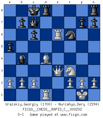 Last move : 0-1 2019 April 14 16:55:22 [Event "FICGS__CHESS__RAPID_C__000202"] [Site "FICGS"] [Date "2019.02.08"] [Round "1"] [White "Uralskiy,Georgiy"] [Black "Nurcahyo,Dery"] [Result "0-1"] [WhiteElo "1700"] [BlackElo "1594"] 1.d4 c6 2.e4 e5 3.Nf3 exd4 4.Qxd4 Ne7 5.Bc4 d5 6.exd5 Nxd5 7.O-O Be6 8.Re1 Qd6 9.Nc3 Nxc3 10.Qxc3 Nd7 11.Bxe6 fxe6 12.Be3 a5 13.Rad1 Qc7 14.Bd4 O-O-O 15.Rxe6 Bb4 16.Qe3 Nf6 0-1 This chess game has been lost on time (started : 2019.02.08 1:50:30) Queen's pawn Kingside Castling by player White (move 7) Queenside Castling by player Black (move 14) Player Black won this chess game. Follow this game move after move (download)I'd rather have a Pawn than a finger. (Reuben Fine) Man kann eine Schachpartie nur gewinnen, wenn das Gleichgewicht gestört ist. In einer Stellung mit ungestörtem Gleichgewicht ist auch das größte Genie hilflos - in der Stellung steckt dann eben kein genialer Einfall. (Wilhelm Steinitz) La batalla por la última verdad nunca sera ganada. Y es por eso que el Ajedrez es tan fascinante. (Hans Kmoch) J'apprécie les joueurs d'est-indienne, c'est grâce à eux que je nourris ma famille depuis tant d'années. (Petrosian) Men never do evil so completely and cheerfully as when they do it from religious conviction. (Blaise Pascal)