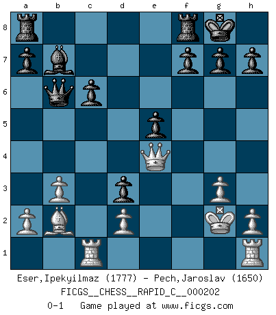 Last move : 0-1 2019 June 28 12:57:21 [Event "FICGS__CHESS__RAPID_C__000202"] [Site "FICGS"] [Date "2019.02.08"] [Round "1"] [White "Eser,Ipekyilmaz"] [Black "Pech,Jaroslav"] [Result "0-1"] [WhiteElo "1777"] [BlackElo "1650"] 1.g3 d5 2.c3 c5 3.c4 d4 4.e3 Nc6 5.exd4 cxd4 6.Bg2 d3 7.Bxc6+ bxc6 8.Nc3 Nf6 9.b3 e5 10.Bb2 Bc5 11.Qf3 O-O 12.Ne4 Nxe4 13.Qxe4 Qb6 14.Kf1 Bxf2 15.Kg2 Bxg1 16.Raxg1 Bb7 17.c5 Qxc5 18.Rc1 Qb6 0-1 This chess game has been lost on time (started : 2019.02.08 1:50:30) Benko's Opening Kingside Castling by player Black (move 11) Player Black won this chess game. Follow this game move after move (download)Capture of the adverse King is the ultimate but not the first object of the game. (William Steinitz) Die Fehler sind da, Sie warten nur darauf gemacht zu werden. (Savielly Grigorievitsch Tartakower) Hay dos clases de hombres: aquellos que se conforman en dejarse llevar por las circunstancias y que juegan barajas y aquellos decididos a controlar las circunstancias y que juegan al Ajedrez. (Mortimer Collins) Les Echecs sont affaire de jugement sensible. Savoir quand frapper et quand esquiver. (Fischer) Panic is a sudden desertion of us, an a going over to the enemy of our imagination. (Christian Nevell Bovee)