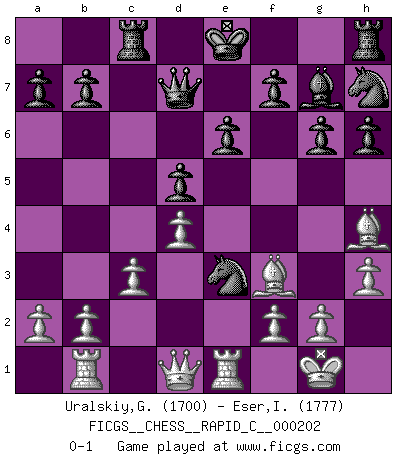 Last move : 0-1 2019 April 28 18:49:12 [Event "FICGS__CHESS__RAPID_C__000202"] [Site "FICGS"] [Date "2019.02.08"] [Round "1"] [White "Uralskiy,Georgiy"] [Black "Eser,Ipekyilmaz"] [Result "0-1"] [WhiteElo "1700"] [BlackElo "1777"] 1.e4 g6 2.d4 d6 3.Nf3 Bg4 4.Be2 Bxf3 5.Bxf3 c6 6.O-O d5 7.exd5 cxd5 8.c3 Qd7 9.Nd2 Nc6 10.Re1 Bg7 11.Nf1 Nf6 12.Bg5 e6 13.Ng3 Rc8 14.h3 Na5 15.Nf1 Nc4 16.Rb1 h6 17.Bh4 Nh7 18.Ne3 Nxe3 0-1 This chess game has been lost on time (started : 2019.02.08 1:50:30) Robatsch (Modern) defense Kingside Castling by player White (move 6) Player Black won this chess game. Follow this game move after move (download)A chess genius has died; a loss for humanity. (Viktor Kortchnoi, about Bobby Fischer's death) Ich moechte nie einem Club beitreten, der Leute wie mich als Mitglieder aufnimmt. (Woody Allen) Preferería tener un Peón que un dedo. (Reuben Fine) Toutes les manuvres exécutées sur une colonne ouverte ont pour but ultime l'intrusion définitive sur la septième ou la huitième rangée, en plein cur de la position ennemie. (Aaron Nimzovitch) If you are good, you will be assigned all the work. If you are really good, you will get out of it. (Dan Rotaru)