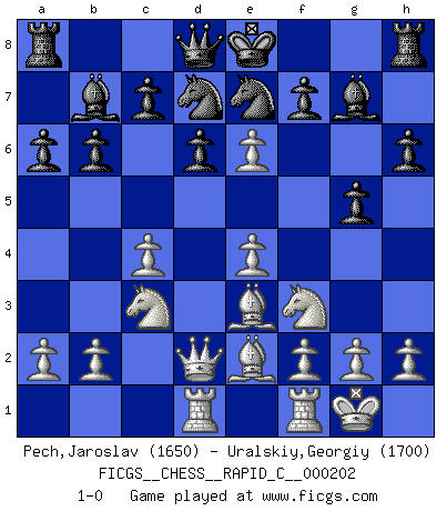 Last move : 1-0 2019 May 17 9:4:38 [Event "FICGS__CHESS__RAPID_C__000202"] [Site "FICGS"] [Date "2019.02.08"] [Round "1"] [White "Pech,Jaroslav"] [Black "Uralskiy,Georgiy"] [Result "1-0"] [WhiteElo "1650"] [BlackElo "1700"] 1.c4 g6 2.Nc3 Bg7 3.d4 d6 4.e4 a6 5.Be3 Nd7 6.Be2 e6 7.Nf3 Ne7 8.O-O b6 9.Qd2 h6 10.Rad1 Bb7 11.d5 g5 12.dxe6 1-0 This chess game has been lost on time (started : 2019.02.08 1:50:30) English Opening Kingside Castling by player White (move 8) Player White won this chess game. Follow this game move after move (download)You need not play well - just help your opponent to play badly. (Genrikh Chepukaitis) Smyslow ist ein Beweis dafür, dass ich noch zehn Jahre spielen kann! [der 75 jährige über den 85 jährigen] (Viktor Kortschnoi) Un Peón pasado es un criminal, quién debe ser mantenido bajo candado y llave. Leves medidas, tales como vigilancia policiaca, no son suficientes. (Aaron Nimzovich) Ce qui caractérise les parties de combat, c'est que si le défenseur a constamment de difficiles problèmes à résoudre, l'attaquant doit chercher sans relâche de nouvelles possibilités d'attaque. (Koblentz) Waiting for chance ? Play in casinos. (FICGS proverb)