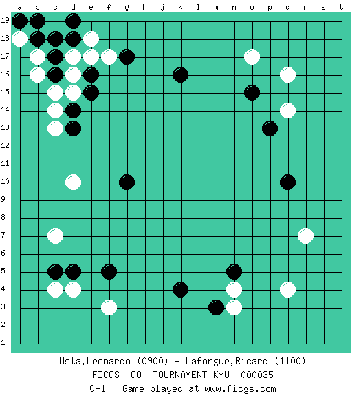 Last move : 0-1 2007 July 31 19:37:22 [Event "FICGS__GO__TOURNAMENT_KYU__000035"] [Site "FICGS"] [Date "2007.05.31"] [Round "1"] [Black "Usta,Leonardo"] [White "Laforgue,Ricard"] [Result "0-1"] [Rating 1 "0900"] [Rating 2 "1100"] 1.k4 d4 2.k16 d16 3.g10 q16 4.o15 q4 5.q10 q14 6.p13 d10 7.f5 n3 8.m3 n4 9.n5 r7 10.e16 e17 11.e15 d15 12.d14 c14 13.d13 f17 14.g17 f3 15.d5 c4 16.c5 c13 17.c17 d17 18.d18 b17 19.c18 b16 20.c16 c15 21.b18 e18 22.d19 o17 23.b19 a18 24.a19 c7 0-1 This go game has been lost on time (started : 2007.05.31 20:28:1) Here are the names of the openings (joseki) played in the four corners : Corner q16 : q16 o15 Hoshi (Hwajeom, Seongjeom, Xingwei`) 4-4 Point. The star or hoshi (4-4) point, emphasizing influence at the potential expense of territory. Corner d4 : d4 f5 Hoshi (Hwajeom, Seongjeom, Xingwei`) 4-4 Point. The star or hoshi (4-4) point, emphasizing influence at the potential expense of territory. Corner d16 : d16 e16 Hoshi (Hwajeom, Seongjeom, Xingwei`) 4-4 Point. The star or hoshi (4-4) point, emphasizing influence at the potential expense of territory. Player White won this Go (weiqi, baduk) game. Follow this game move after move (download)The second line is the line of defeat, the third line is the line of territory, and the fourth line is the line of influence. (Anonymous) Hold em is to stud what chess is to checkers. (Johnny Moss)