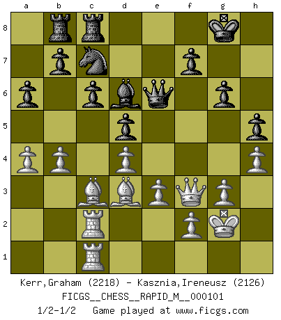 Last move : 1/2-1/2 2019 May 10 12:27:50 [Event "FICGS__CHESS__RAPID_M__000101"] [Site "FICGS"] [Date "2019.02.09"] [Round "1"] [White "Kerr,Graham"] [Black "Kasznia,Ireneusz"] [Result "1/2-1/2"] [WhiteElo "2218"] [BlackElo "2126"] 1.d4 Nf6 2.c4 g6 3.g3 c6 4.Bg2 d5 5.Nf3 dxc4 6.a4 Bg7 7.O-O Na6 8.Na3 Ne4 9.Nxc4 Be6 10.Nfe5 Nd6 11.Nxd6+ exd6 12.Nd3 Nc7 13.Nf4 d5 14.Nxe6 Nxe6 15.e3 O-O 16.b4 a6 17.Bd2 Qd7 18.h4 Rfe8 19.Qf3 Nc7 20.Rfc1 Bf8 21.Kh2 h5 22.Be1 Red8 23.Rab1 Bd6 24.Rc2 Kg7 25.Bc3 Qe7 26.Kg1 Qe6 27.Qd1 Kg8 28.Be1 Re8 29.Bf1 Reb8 30.Bd3 Rc8 31.Kg2 Bf8 32.Qf3 Rab8 33.Rbc1 Bd6 34.Bc3 1/2-1/2 Graham Kerr gg, thanks ;-) King's Indian : 3.g3 Kingside Castling by player White (move 7) Kingside Castling by player Black (move 15) This chess game ended in a draw. Follow this game move after move (download)I still hope to kill Fischer. (Boris Spassky) Über die Verhaftung Bobby Fischers: Warum es die Bush-Administration für nötig befindet einen 61 Jahre alten Mann zu hetzten, der für niemanden ausser sich selbste eine Gefahr darstellt ist ein Rätsel. (Nigel Short) La esencia del Ajedrez es pensar acerca de lo que el Ajedrez es. (David Bronstein) Même si l'adversaire joue le coup analysé précédemment, recommencez l'analyse en voyant la nouvelle position. Première règle de Blumenfeld There are three kinds of lies: lies, damned lies and statistics. (Mark Twain)