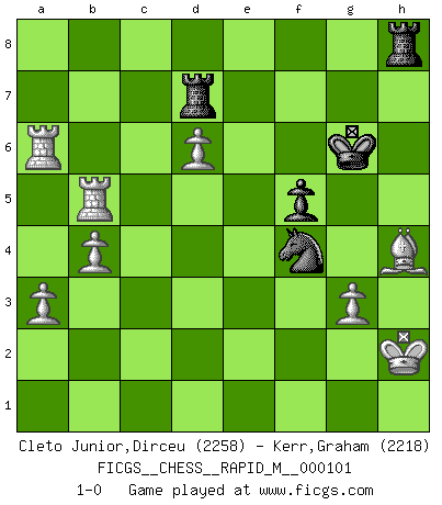 Last move : 1-0 2019 June 13 21:56:10 [Event "FICGS__CHESS__RAPID_M__000101"] [Site "FICGS"] [Date "2019.02.09"] [Round "1"] [White "Cleto Junior,Dirceu"] [Black "Kerr,Graham"] [Result "1-0"] [WhiteElo "2258"] [BlackElo "2218"] 1.e4 c5 2.d4 cxd4 3.c3 dxc3 4.Nxc3 Nc6 5.Nf3 e6 6.Bc4 a6 7.O-O b5 8.Bd3 Bb7 9.Bf4 Bb4 10.Qe2 Nge7 11.Rfd1 O-O 12.Bg3 h6 13.a3 Ba5 14.Rac1 Rc8 15.Bb1 Ng6 16.h4 f6 17.Ba2 Re8 18.h5 Nge5 19.Nh4 Bb6 20.Rd2 Na5 21.Rcd1 Bc6 22.Ng6 Nac4 23.Bxc4 Nxc4 24.Rd3 e5 25.Nh4 d5 26.Nxd5 Bd4 27.Nf5 Bxd5 28.Qg4 Rc7 29.exd5 Rd7 30.b3 Nd6 31.Nxd4 exd4 32.Rxd4 Qe7 33.Rc1 Red8 34.Qe6+ Qf7 35.Rc6 Ne8 36.Qxf7+ Kxf7 37.d6 Ra8 38.f3 g5 39.hxg6+ Kxg6 40.Rd5 Kf7 41.Kh2 Ke6 42.Rd1 h5 43.Kh3 Kf5 44.Rc5+ Kg6 45.f4 Ng7 46.R1d5 f5 47.Kh2 h4 48.Bxh4 Rh8 49.g3 Ne6 50.b4 Kg7 51.Rc6 Kg6 52.Rxa6 Nxf4 53.Rxb5 1-0 Sicilian : Smith-Morra gambit Kingside Castling by player White (move 7) Kingside Castling by player Black (move 11) Player White won this chess game. Follow this game move after move (download)By this measure (on the gap between Fischer & his contemporaries), I consider him the greatest world champion. (Garry Kasparov) Wer mein Gambit spielt, muß bereit sein, alle Brücken hinter sich abzubrechen. Es verändert den ganzen Menschen. Es wirkt wie ein Zauberstab und fördert verkümmerte, gute Charakter- eigenschaften wieder zu Tage. (Emil Joseph Diemer) El Ajedrez hace al hombre ser mas sabio y ver mas claro. (Vladimir Putin) En blitz, le Cavalier l'emporte sur le Fou. (Vlastimil Hort) Think like a man of action, act like a man of thought. (Henri Louis Bergson)