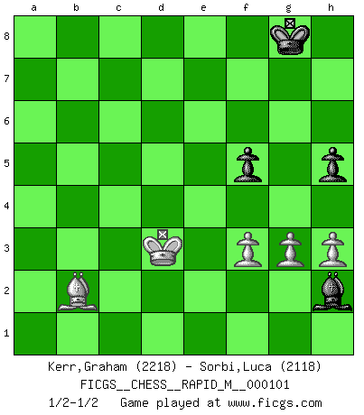 Last move : 1/2-1/2 2019 June 16 11:33:36 [Event "FICGS__CHESS__RAPID_M__000101"] [Site "FICGS"] [Date "2019.02.09"] [Round "1"] [White "Kerr,Graham"] [Black "Sorbi,Luca"] [Result "1/2-1/2"] [WhiteElo "2218"] [BlackElo "2118"] 1.d4 Nf6 2.c4 e6 3.Nf3 b6 4.g3 Ba6 5.b3 Bb4+ 6.Bd2 Be7 7.Nc3 O-O 8.Bg2 c6 9.O-O d5 10.Bf4 Nbd7 11.Qd3 Rc8 12.Rac1 dxc4 13.bxc4 Nd5 14.Rfd1 Nb4 15.Qb1 Bxc4 16.e4 b5 17.a3 Na6 18.d5 cxd5 19.exd5 e5 20.Nxe5 Nxe5 21.Bxe5 Bxa3 22.Rc2 Qd7 23.Ne4 f5 24.Ng5 Rfe8 25.Qa1 Bf8 26.d6 Nb4 27.Rcd2 h6 28.Nf3 Nc6 29.Bb2 Re2 30.Nh4 Rxd2 31.Rxd2 Rd8 32.Qb1 Be6 33.Bh3 Qf7 34.Nxf5 g6 35.Qc1 Bxf5 36.Bxf5 gxf5 37.Qxc6 Qe6 38.Qxb5 Rxd6 39.Rxd6 Bxd6 40.Qa5 Be7 41.Qxa7 Qe1+ 42.Kg2 Qe4+ 43.f3 Qe2+ 44.Qf2 Qxf2+ 45.Kxf2 Bc5+ 46.Ke2 h5 47.Kd3 Bg1 48.h3 Bh2 1/2-1/2 Queen's Indian : Nimzovich variation (exaggerated Fianchetto) Kingside Castling by player Black (move 7) Kingside Castling by player White (move 9) 10 pieces endgame at move 44 : White KBPPP , Black KQBPP WHITE : King + 1 Bishop 3 Pawns BLACK : King + 1 Queen 1 Bishop 2 Pawns 9 pieces endgame at move 45 : White KBPPP , Black KBPP WHITE : King + 1 Bishop 3 Pawns BLACK : King + 1 Bishop 2 Pawns This chess game ended in a draw. Follow this game move after move (download)It is difficult to play against Einstein's theory --on his first loss to Fischer. (Mikhail Tal) Der Schachmeister von Heute braucht Courage, einen Killerinstinkt, Ausdauer und Arroganz. (Larry Evans) Un entendimiento a fondo de las continuaciones típicas del mate, hace de las combinaciones de sacrificio mas complicadas conducirlas a ellas no solo sin dificultad, sino casi de una manera natural. (Siegbert Tarrasch) Je ne suis pas le dernier à jouer lâchement des coups douteux pendant le zeïtnot de l'adversaire pour l'achever: en effet les coups qui font le plus peur sont ceux que l'on ne comprend pas. Je me fais souvent peur quand je joue. (Un professeur anonyme) Winning isn't everything... but losing is nothing. (Mednis)