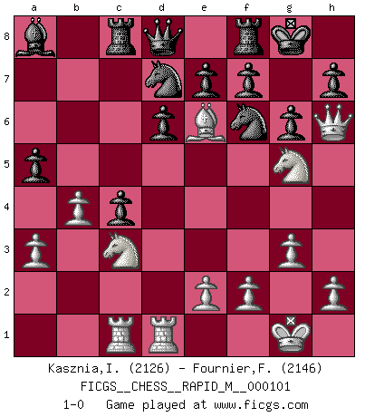 Last move : 1-0 2019 March 11 18:20:23 [Event "FICGS__CHESS__RAPID_M__000101"] [Site "FICGS"] [Date "2019.02.09"] [Round "1"] [White "Kasznia,Ireneusz"] [Black "Fournier,Frederic"] [Result "1-0"] [WhiteElo "2126"] [BlackElo "2146"] 1.Nf3 Nf6 2.g3 b6 3.Bg2 Bb7 4.c4 c5 5.O-O g6 6.d4 cxd4 7.Qxd4 Bg7 8.Nc3 d6 9.Rd1 Nbd7 10.Be3 Rc8 11.Rac1 O-O 12.Qh4 Re8 13.b3 a6 14.Bh3 Ba8 15.Bh6 Bxh6 16.Qxh6 b5 17.Ng5 bxc4 18.Be6 Rf8 19.b4 a5 20.a3 1-0 Reti Opening Kingside Castling by player White (move 5) Kingside Castling by player Black (move 11) Player White won this chess game. Follow this game move after move (download)I had a toothache during the first game. In the second game I had a headache. In the third game it was an attack of rheumatism. In the fourth game, I wasn't feeling well. And in the fifth game? Well, must one have to win every game ? (Siegbert Tarrasch) Du weisst es gibt ein Problem mit Computern und Fernschach, wenn jeder eine Rating von 2450 hat. (John Christen Knudsen) El Ajedrez es tan interesante por sí solo, que no es necesario un interés monetario para persuadir a una persona a que lo practique; por lo tanto, nunca se juega por dinero. (Benjamin Franklin) Horreur, mais aussi harmonie suprême : qu'y avait-il en effet au monde en dehors des échecs ? Le brouillard, l'inconnu, le non-être... (Vladimir Nabokov) The real voyage of discovery consists not in seeking new lands but in seeing with new eyes. (Marcel Proust)