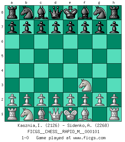 Last move : 1-0 2019 March 11 22:49:8 [Event "FICGS__CHESS__RAPID_M__000101"] [Site "FICGS"] [Date "2019.02.09"] [Round "1"] [White "Kasznia,Ireneusz"] [Black "Sidenko,Anatoly"] [Result "1-0"] [WhiteElo "2126"] [BlackElo "2268"] 1.Nf3 1-0 This chess game has been lost on time (started : 2019.02.09 1:23:16) Reti Opening Player White won this chess game. Follow this game move after move (download)Suddenly it was obvious to me in my analysis I had missed what Fischer had found with the greatest of ease at the board. (Mikhail Botvinnik) Intelligenz läßt sich nicht am Weg, sondern nur am Ergebnis feststellen. (Garry Kasparov) Una clavada es mas poderosa que una espada. (Fred Reinfeld) Tout change constamment, y compris dans le monde des Echecs. (Botvinnik) You have to believe in yourself. (Sun Tzu)