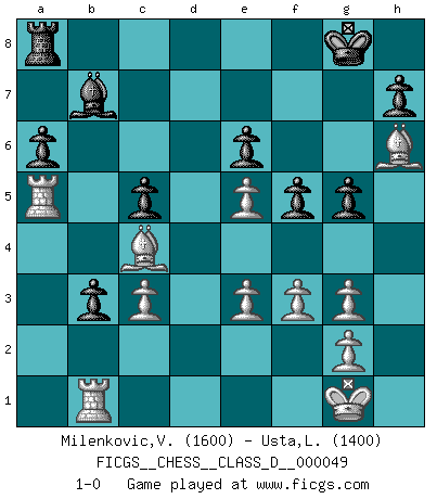 Last move : 1-0 2007 June 17 18:47:50 [Event "FICGS__CHESS__CLASS_D__000049"] [Site "FICGS"] [Date "2007.06.01"] [Round "1"] [White "Milenkovic,Vladimir"] [Black "Usta,Leonardo"] [Result "1-0"] [WhiteElo "1600"] [BlackElo "1400"] 1.d4 d5 2.c4 e6 3.Nc3 Bb4 4.Nf3 Nf6 5.Qc2 Ne4 6.e3 O-O 7.Bd3 f5 8.O-O Bxc3 9.bxc3 c6 10.a4 a6 11.a5 g5 12.Ba3 Rf6 13.Ne5 Nd7 14.f3 Ng3 15.hxg3 Nxe5 16.dxe5 Rh6 17.Qb3 Qxa5 18.Bf8 dxc4 19.Rxa5 cxb3 20.Bxh6 b5 21.Rb1 c5 22.Bxb5 Bb7 23.Bc4 1-0 QGD : 3.Nc3 Kingside Castling by player Black (move 6) Kingside Castling by player White (move 8) Player White won this chess game. Follow this game move after move (download)The game of chess is the touchstone of the intellect. (Goethe) Es war undenkbar für die Behörden, dass ein sowjetischer Großmeister auf diese Art und Weise [Fischer-Taimanov 6:0] verliert, ohne dass es eine politischer Erklärung dafür gäbe. (Mark Taimanov) Yo considero que Fischer es uno de los expertos mas grandes de aperturas de siempre. (Keith Hayward) Avec des compensations pour le matériel en plus... (Anonyme) In every real man a child is hidden that wants to play. (Friedrich Nietzsche)