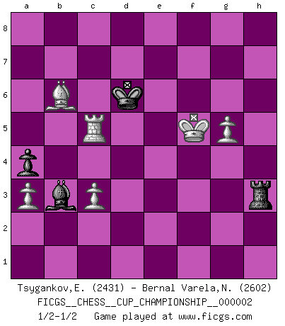 Last move : 1/2-1/2 2019 September 1 18:47:49 [Event "FICGS__CHESS__CUP_CHAMPIONSHIP__000002"] [Site "FICGS"] [Date "2019.02.09"] [Round "1"] [White "Tsygankov,Evgeny"] [Black "Bernal Varela,Nelson"] [Result "1/2-1/2"] [WhiteElo "2431"] [BlackElo "2602"] 1.e4 e6 2.d4 d5 3.Nc3 Nf6 4.e5 Nfd7 5.f4 c5 6.Nf3 cxd4 7.Nb5 Qa5+ 8.Bd2 Qb6 9.Nbxd4 Nc6 10.c3 Bc5 11.Bc1 a5 12.Be2 Ndb8 13.O-O Nxd4 14.cxd4 Be7 15.Be3 Bd7 16.Ne1 a4 17.Nd3 O-O 18.Nc5 Bxc5 19.dxc5 Qb4 20.a3 Qa5 21.Rf3 Nc6 22.Bd3 f5 23.exf6 Rxf6 24.Rg3 Be8 25.Qc2 h6 26.Rf1 Bh5 27.Qc1 Raf8 28.Re1 R8f7 29.Qc3 Qxc3 30.bxc3 e5 31.fxe5 Nxe5 32.Bc2 Be2 33.h3 Bb5 34.Bxh6 Rf1+ 35.Rxf1 Rxf1+ 36.Kh2 Rf7 37.Be3 Nc4 38.Bg6 Re7 39.c6 Bxc6 40.Bc5 Re6 41.Bf5 Re5 42.Bd3 Nd2 43.Bd4 Re7 44.Rg5 Ne4 45.Rf5 g6 46.Rf4 b5 47.Rh4 Rh7 48.Rg4 Kf7 49.Rf4+ Kg8 50.Bb1 Re7 51.Rh4 Rh7 52.Rg4 Be8 53.Ba2 Bf7 54.Rf4 Rh5 55.Bb1 Rh7 56.Rg4 Be8 57.Bxe4 dxe4 58.Rxe4 Bf7 59.Rf4 Bc4 60.Rf6 Bd3 61.Rd6 Kf7 62.g4 Ke8 63.Kg3 Rd7 64.Ra6 Rf7 65.Re6+ Re7 66.Rd6 Rd7 67.Ra6 Rf7 68.Bc5 Rf1 69.Rd6 Bc2 70.Bb4 Rd1 71.Re6+ Kf7 72.Re5 Rd3+ 73.Kh4 Bb3 74.Rxb5 Kf6 75.Ba5 Bc4 76.Rc5 Bd5 77.Bd8+ Ke6 78.Kg5 Rxh3 79.Kxg6 Kd6 80.Bb6 Be6 81.g5 Bb3 82.Kf5 1/2-1/2 French : Steinitz variation Kingside Castling by player White (move 13) Kingside Castling by player Black (move 17) 10 pieces endgame at move 79 : White KRBPPP , Black KRBP WHITE : King + 1 Rook 1 Bishop 3 Pawns BLACK : King + 1 Rook 1 Bishop 1 Pawn This chess game ended in a draw. Follow this game move after move (download)After black's reply to 1.e4 with 1..e5, leaves him always trying to get into the game. (Howard Staunton) Vom Schach wurde gesagt das Leben sei dafür nicht lange genug. Aber das ist der Fehler des Lebens, nicht des Schach'. (Irving Chernev) Aquellos que dicen entender al Ajedrez, no entienden nada. (Robert Hubner) Nous sommes les pions de la mystérieuse partie d'Echecs jouée par Dieu. Il nous déplace, nous arrête, nous pousse encore, puis nous lance un à un dans la boîte du Néant. Epitaphe sur la tombe de David Janowsky (1868-1927). Without deviation from the norm, progress is not possible. (Frank Zappa)