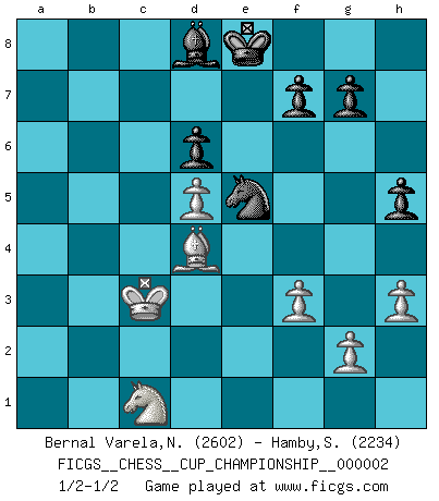 Last move : 1/2-1/2 2019 July 16 11:4:33 [Event "FICGS__CHESS__CUP_CHAMPIONSHIP__000002"] [Site "FICGS"] [Date "2019.02.09"] [Round "1"] [White "Bernal Varela,Nelson"] [Black "Hamby,Stephen"] [Result "1/2-1/2"] [WhiteElo "2602"] [BlackElo "2234"] 1.e4 c5 2.Nf3 d6 3.Bb5+ Nd7 4.c3 Ngf6 5.Qe2 a6 6.Ba4 b5 7.Bc2 Bb7 8.d4 e6 9.a4 cxd4 10.cxd4 Be7 11.O-O O-O 12.Re1 Qc7 13.Bd3 Nb6 14.axb5 axb5 15.Rxa8 Rxa8 16.Bg5 b4 17.Rc1 Qb8 18.Nbd2 h6 19.Bh4 Nbd7 20.Nb3 Nf8 21.Ne1 Qa7 22.Bg3 Qb6 23.h3 Rc8 24.Rxc8 Bxc8 25.Bf4 Bd7 26.Be3 Qb8 27.Nc1 Ng6 28.Qc2 Bd8 29.Qd2 Ne7 30.f3 Nc6 31.Bf2 Ne8 32.Nb3 Na5 33.Nxa5 Bxa5 34.Bc4 Nc7 35.Qf4 Bb5 36.Bxb5 Nxb5 37.Qc1 b3 38.Nd3 Qc7 39.Qxc7 Nxc7 40.Nc1 Bc3 41.Nd3 Ba5 42.Kf1 Nb5 43.Ke2 Kf8 44.Nc1 Nc3+ 45.Kf1 Na4 46.Nxb3 Bc7 47.d5 exd5 48.exd5 Nxb2 49.Ke2 Nc4 50.Kd3 Ne5+ 51.Kc3 Ke8 52.Be3 Bd8 53.Bd4 h5 54.Nc1 1/2-1/2 Sicilian : Canal-Sokolsky (Nimzovich-Rossolimo, Moscow) attack Kingside Castling by player White (move 11) Kingside Castling by player Black (move 11) This chess game ended in a draw. Follow this game move after move (download)The hardest game to win is a won game. (Emanuel Lasker) Ich organisiere ein großes Turnier, was mich etwa 120000 Dollar kostet. Ich denke, das ist das erste Mal in der Schachgeschichte, daß ein Schachgroßmeister auch als Mäzen auftritt. (Miguel Najdorf) ¡Examina movidas que hagan daño! Un buen ojo for movidas desvastantes es mucho mas importante que el conocimiento de principios estratégicos. (Purdy) Les échecs sont un jeu terrible. Si vous n'avez pas le centre, votre adversaire a une position plus libre. Par contre, si vous avez le centre, alors vous avez vraiment quelque chose pour laquelle vous inquiéter ! (Siegbert Tarrasch) If we don't succeed, we run the risk of failure. (George W. Bush)