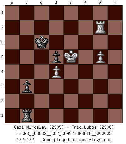 Last move : 1/2-1/2 2019 August 25 19:23:41 [Event "FICGS__CHESS__CUP_CHAMPIONSHIP__000002"] [Site "FICGS"] [Date "2019.02.09"] [Round "1"] [White "Gazi,Miroslav"] [Black "Fric,Lubos"] [Result "1/2-1/2"] [WhiteElo "2305"] [BlackElo "2300"] 1.Nf3 Nf6 2.c4 e6 3.Nc3 d5 4.d4 Be7 5.Bf4 O-O 6.e3 Nbd7 7.a3 c5 8.cxd5 Nxd5 9.Nxd5 exd5 10.dxc5 Nxc5 11.Be5 Bf5 12.Be2 Bf6 13.O-O Bxe5 14.Nxe5 Rc8 15.Nf3 Ne6 16.Nd4 Be4 17.f3 Bg6 18.Qd2 Qf6 19.Rac1 h6 20.h3 Rfd8 21.Rfd1 Nxd4 22.Qxd4 Qxd4 23.exd4 Kf8 24.Kf2 Ke7 25.Ke3 Kd6 26.Kd2 Bf5 27.h4 a5 28.Rc3 Bd7 29.Rdc1 Rc6 30.Rxc6+ Bxc6 31.h5 Rg8 32.Rc3 g6 33.hxg6 fxg6 34.f4 Rf8 35.Rg3 Be8 36.Re3 Bd7 37.g3 g5 38.fxg5 hxg5 39.Rb3 Rb8 40.Rf3 Rh8 41.Rf6+ Kc7 42.Rf7 Rh2 43.Ke3 Kd6 44.Rf6+ Kc7 45.Rg6 g4 46.Rg7 Kd6 47.b3 b5 48.Rg6+ Kc7 49.Bxg4 Bxg4 50.Rxg4 Rb2 51.b4 axb4 52.Rg7+ Kb6 53.axb4 Rxb4 54.g4 Rb3+ 55.Kf4 b4 56.g5 Rb1 57.Ke5 b3 58.Rg8 Kb7 59.Rg7+ Kc6 60.Rg6+ Kc7 61.Rg7+ Kc6 62.Rg6+ Kc7 63.Rg7+ Kc6 1/2-1/2 Reti Opening Kingside Castling by player Black (move 5) Kingside Castling by player White (move 13) 10 pieces endgame at move 51 : White KRPPP , Black KRPPP WHITE : King + 1 Rook 3 Pawns BLACK : King + 1 Rook 3 Pawns 9 pieces endgame at move 53 : White KRPPP , Black KRPP WHITE : King + 1 Rook 3 Pawns BLACK : King + 1 Rook 2 Pawns 8 pieces endgame at move 53 : White KRPP , Black KRPP WHITE : King + 1 Rook 2 Pawns BLACK : King + 1 Rook 2 Pawns This chess game ended in a draw. Follow this game move after move (download)When you play Bobby, it is not a question if you win or lose. It is a question if you survive. (Boris Spassky) Es gibt zwei Arten von Opfern: Korrekte und meine. (Mikhail Nekhemyevich Tal) Es el objetivo de la escuela moderna no tratar cada posición de acuerdo a una regla general, sino de acuerdo al principio inherente en la posición. (Richard Reti) Je ne crois pas en la psychologie, je crois aux bons coups. (Robert Fischer) Men never do evil so completely and cheerfully as when they do it from religious conviction. (Blaise Pascal)