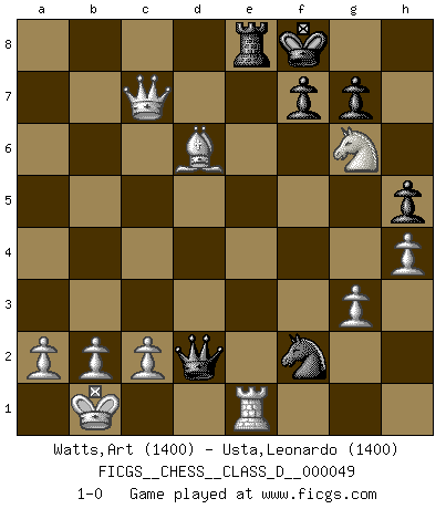 Last move : 1-0 2007 August 20 22:38:36 [Event "FICGS__CHESS__CLASS_D__000049"] [Site "FICGS"] [Date "2007.06.01"] [Round "1"] [White "Watts,Art"] [Black "Usta,Leonardo"] [Result "1-0"] [WhiteElo "1400"] [BlackElo "1400"] 1.e4 e5 2.Nf3 d6 3.d4 exd4 4.Qxd4 Nc6 5.Bb5 Bd7 6.Bxc6 Bxc6 7.Nc3 Nf6 8.Bg5 Be7 9.O-O-O O-O 10.Rhe1 Re8 11.Kb1 h6 12.Bf4 Ng4 13.Qd2 Nf6 14.Nd4 Bd7 15.Nf5 Bxf5 16.exf5 Qd7 17.Qd3 Bf8 18.h4 Re7 19.Rxe7 Bxe7 20.g3 Ng4 21.Qf3 h5 22.Qxb7 Re8 23.Qxa7 Qxf5 24.Qxc7 Nxf2 25.Re1 Qf6 26.Nd5 Qd4 27.Nxe7+ Kf8 28.Bxd6 Qd2 29.Ng6+ 1-0 Philidor : Exchange variation Queenside Castling by player White (move 9) Kingside Castling by player Black (move 9) Player White won this chess game. Follow this game move after move (download)Before the endgame, the Gods have placed the middle game. (Siegbert Tarrasch) Ich spiele 70 Eröffnungssysteme. (Viktor Kortschnoi) En manos de Fischer's, una diminuta ventaja teórica es tan buena como tener una Reina de ventaja. (Isaac Kashdan) A ce moment-là, je menaçais de comprendre la position ! (Clément L'Heureux) A mistake is only a mistake if you let it happen twice. Otherwise it is a learning experience. (Daniel Parmet)