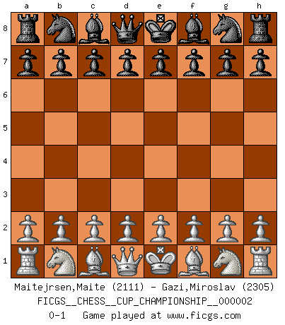 Last move : 0-1 2019 March 11 10:34:49 [Event "FICGS__CHESS__CUP_CHAMPIONSHIP__000002"] [Site "FICGS"] [Date "2019.02.09"] [Round "1"] [White "Maitejrsen,Maite"] [Black "Gazi,Miroslav"] [Result "0-1"] [WhiteElo "2111"] [BlackElo "2305"] 0-1 This chess game has been lost on time (started : 2019.02.09 2:12:41) Player Black won this chess game. Follow this game move after move (download)Chess is everything: art, science and sport. (Anatoly Karpov) Ich spiele ehrlich und spiele, um zu gewinnen. Wenn ich verliere nehme ich meine Medizin. (Robert James Fischer) Con o sin el título, Bobby Fischer fue sin lugar a dudas el mas grande jugador de su época. (Burt Hochberg) La menace est plus forte que l'exécution. (Aaron Nimzovitch) The question of whether computers can think is just like question of whether submarines can swim. (Edsger W. Dijkstra)