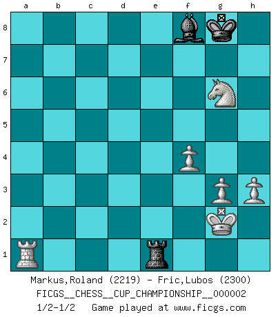 Last move : 1/2-1/2 2019 July 22 20:14:39 [Event "FICGS__CHESS__CUP_CHAMPIONSHIP__000002"] [Site "FICGS"] [Date "2019.02.09"] [Round "1"] [White "Markus,Roland"] [Black "Fric,Lubos"] [Result "1/2-1/2"] [WhiteElo "2219"] [BlackElo "2300"] 1.Nf3 Nf6 2.d4 d5 3.c4 e6 4.Nc3 c6 5.Bg5 h6 6.Bxf6 Qxf6 7.e3 Nd7 8.Bd3 dxc4 9.Bxc4 g6 10.O-O Bg7 11.e4 e5 12.d5 Nb6 13.Nd2 O-O 14.Qe2 h5 15.Bb3 Bg4 16.f3 Bd7 17.Qf2 Qe7 18.Rfd1 Bh6 19.Kh1 Kg7 20.Re1 Rac8 21.Rad1 h4 22.h3 Rfd8 23.Nf1 c5 24.d6 Qf6 25.Bd5 Na4 26.Bxb7 Rb8 27.Nd5 Qxd6 28.Nc3 Qb6 29.Nxa4 Bxa4 30.Rxd8 Rxd8 31.Bd5 Qb4 32.b3 Bb5 33.Rd1 Bg5 34.Qc2 Rc8 35.Nd2 Rd8 36.Nf1 Bf4 37.Qf2 c4 38.bxc4 Bxc4 39.Qxh4 Qa5 40.Qf2 Qa4 41.Re1 Bxd5 42.exd5 Rxd5 43.g3 Bg5 44.Ne3 Ra5 45.Ng4 Qxa2 46.Qxa2 Rxa2 47.Rxe5 Bd8 48.Rd5 Bc7 49.f4 a5 50.Rc5 Bd6 51.Rc6 Bf8 52.Ne5 a4 53.Rc7 Re2 54.Rxf7+ Kg8 55.Ra7 a3 56.Ra8 a2 57.Nxg6 Re1+ 58.Kg2 a1Q 59.Rxa1 1/2-1/2 Reti Opening Kingside Castling by player White (move 10) Kingside Castling by player Black (move 13) 10 pieces endgame at move 57 : White KRNPPP , Black KRBP WHITE : King + 1 Rook 1 Knight 3 Pawns BLACK : King + 1 Rook 1 Bishop 1 Pawn Promotion Queen by player Black (move 58) 9 pieces endgame at move 59 : White KRNPPP , Black KRB WHITE : King + 1 Rook 1 Knight 3 Pawns BLACK : King + 1 Rook 1 Bishop This chess game ended in a draw. Follow this game move after move (download)The tactician must know what to do whenever something needs doing; the strategist must know what to do when nothing needs doing. (Savielly Tartakover) Alles was am Schachbrett zählt sind gute Züge. (Robert James Fischer) Un juego de Ajedrez es un dialogo, una conversación entre un jugador y su oponente. Cada movimiento del oponente puede contener amenazas o tropiezos, pero un jugador no se puede defender de las amenazas o tomar ventaja de los tropiezos si es que no se pregunta a sí mismo: ¿Que es lo que mi oponente va a hacer después de cada movida?. (Bruce A. Moon) Plusieurs personnes se sont demandées comment Tal faisait pour gagner... En fait, c'est très simple ! Il met ses pièces au centre de l'échiquier et les sacrifie quelque part ! (David Bronstein) If we knew what we were doing, we would not call it research. (Albert Einstein)