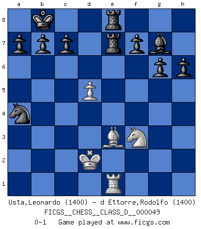 Last move : 0-1 2007 June 20 15:55:11 [Event "FICGS__CHESS__CLASS_D__000049"] [Site "FICGS"] [Date "2007.06.01"] [Round "1"] [White "Usta,Leonardo"] [Black "d Ettorre,Rodolfo"] [Result "0-1"] [WhiteElo "1400"] [BlackElo "1400"] 1.e4 e5 2.f4 exf4 3.d4 Qh4+ 4.g3 fxg3 5.Nf3 g2 6.Nxh4 gxh1Q 7.Nf3 d6 8.Nbd2 Bg4 9.Kf2 Qxh2+ 10.Nxh2 Bxd1 11.c4 Nf6 12.Ke3 g6 13.Kd3 Nc6 14.a3 O-O-O 15.Ndf3 Bxf3 16.Nxf3 Re8 17.Ng5 Nd8 18.Bh3+ Kb8 19.b4 h6 20.Nf3 Nxe4 21.Be3 Bg7 22.a4 Ne6 23.Bxe6 Rxe6 24.Re1 Rhe8 25.d5 R6e7 26.c5 dxc5 27.bxc5 Nxc5+ 28.Kd2 Nxa4 0-1 KGA : Villemson (Steinitz) gambit Promotion Queen by player Black (move 6) Queenside Castling by player Black (move 14) Player Black won this chess game. Follow this game move after move (download)Chess is a fairy tale of 1001 blunders. (Savielly Tartakower) Schach ist Leben. (Robert James Fischer) Bobby solo arroja las piezas y solas caen en las casillas correctas. (Miguel Najdorf ) Les erreurs sont comme les malheurs, elles n'arrivent jamais seules. (Siegbert Tarrasch) Computers are like Old Testament gods; lots of rules and no mercy. (Joseph Campbell)