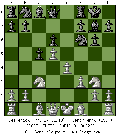 Last move : 1-0 2019 April 1 14:27:52 [Event "FICGS__CHESS__RAPID_A__000232"] [Site "FICGS"] [Date "2019.02.09"] [Round "1"] [White "Vestenicky,Patrik"] [Black "Veron,Mark"] [Result "1-0"] [WhiteElo "1913"] [BlackElo "1900"] 1.d4 Nf6 2.c4 g6 3.f3 d6 4.e4 Bg7 5.Ne2 O-O 6.Nbc3 c5 7.d5 e6 8.Ng3 exd5 9.cxd5 1-0 This chess game has been lost on time (started : 2019.02.09 2:54:53) King's Indian defense Kingside Castling by player Black (move 5) Player White won this chess game. Follow this game move after move (download)In a gambit you give up a Pawn for the sake of getting a lost game. (Samuel Standige Boden) Wenn Dein Gegner dir ein Remis anbietet, versuch herauszufinden, weshalb er glaubt schlechter zu stehen. (Nigel Short) Ser exitoso en el Ajedrez te permite descubrir tu propia personalidad. Eso es lo que deseo para los niños de mi clase. (Saudin Robovic) Ce qui est bien, c'est d'avoir tout un tas de pièces en prise : l'adversaire ne peut en prendre qu'une à la fois. Cité par Thierry Audin. Computers have lots of memory but no imagination. (Anonymous)