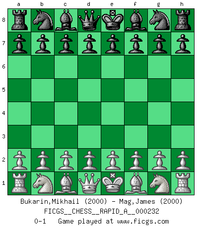 Last move : 0-1 2019 March 11 10:34:49 [Event "FICGS__CHESS__RAPID_A__000232"] [Site "FICGS"] [Date "2019.02.09"] [Round "1"] [White "Bukarin,Mikhail"] [Black "Mag,James"] [Result "0-1"] [WhiteElo "2000"] [BlackElo "2000"] 0-1 This chess game has been lost on time (started : 2019.02.09 2:54:53) Player Black won this chess game. Follow this game move after move (download)No price is too great for the scalp of the enemy King. (Koblentz) Jeder weiß, dass Gasprom Putins persönliches Machtinstrument ist. Die Firma wird vom Kreml aus geleitet und wird schon deshalb nie transparent sein. (Garry Kasparov) El Ajedrez es un mar en el cual un mosquito puede beber y un elefante puede bañarse. (Refrán Hindú) Je menace de comprendre la position. (Anonyme) Excelling at chess has long been considered a symbol of more general intelligence. That is an incorrect assumption in my view, as pleasant as it might be. But for the purposes of argument and investigation, chess is, in Russkin-Gutman's words, 'an unparalleled laboratory, since both the learning process and the degree of ability obtained can be objectified and quantified, providing an excellent comparative framework on which to use rigorous analytical techniques.' (The Chess Master and the Computer, by Garry Kasparov - 2010)