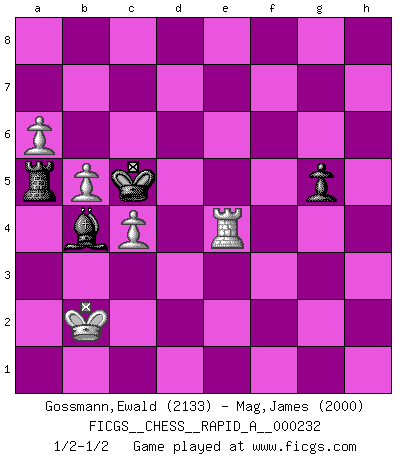 Last move : 1/2-1/2 2019 April 3 2:10:32 [Event "FICGS__CHESS__RAPID_A__000232"] [Site "FICGS"] [Date "2019.02.09"] [Round "1"] [White "Gossmann,Ewald"] [Black "Mag,James"] [Result "1/2-1/2"] [WhiteElo "2133"] [BlackElo "2000"] 1.e4 c5 2.Nf3 d6 3.d4 cxd4 4.Nxd4 Nf6 5.Nc3 a6 6.h3 e6 7.g4 Be7 8.Bg2 O-O 9.g5 Nfd7 10.f4 b5 11.a3 Bb7 12.h4 Nc6 13.Nxc6 Bxc6 14.Be3 Nb6 15.b3 Qc7 16.O-O Rac8 17.h5 d5 18.Qd4 Ba8 19.Nxd5 exd5 20.Qxb6 Qxb6 21.Bxb6 dxe4 22.Rf2 f6 23.a4 fxg5 24.fxg5 Rxf2 25.Bxf2 Bxg5 26.axb5 e3 27.Bxa8 exf2+ 28.Kxf2 Rxa8 29.bxa6 Kf7 30.b4 Ke6 31.b5 Bd8 32.c4 Kd6 33.Ke2 Bb6 34.Rf1 Kc5 35.Kd3 Rd8+ 36.Kc3 Ba5+ 37.Kb3 Rd3+ 38.Kc2 Ra3 39.Kb2 Bb4 40.Rf4 g5 41.hxg6 hxg6 42.Rg4 g5 43.Re4 Ra5 1/2-1/2 Sicilian : Najdorf, Adams attack Kingside Castling by player Black (move 8) Kingside Castling by player White (move 16) 10 pieces endgame at move 41 : White KRPPPP , Black KRBP WHITE : King + 1 Rook 4 Pawns BLACK : King + 1 Rook 1 Bishop 1 Pawn 9 pieces endgame at move 41 : White KRPPP , Black KRBP WHITE : King + 1 Rook 3 Pawns BLACK : King + 1 Rook 1 Bishop 1 Pawn This chess game ended in a draw. Follow this game move after move (download)Chess holds its master in its own bonds, shackling the mind and brain so that the inner freedom of the very strongest must suffer. (Albert Einstein) Rubinstein ist ein Turmendspiel, welches die Götter vor tausenden von Jahren begannen. (Savielly Grigorievitsch Tartakower) Haz el enroque temprano y seguido. (Rob Sillars) Le joueur d'Echecs qui veut atteindre le top est obligé de développer son propre credo créatif. Alexeï Stepanovicth Souétine. Il est facile d'écrire des livres ! Ce qui est difficile, c'est de jouer ! (Alexeï Stepanovicth Souétine) The meaning of life is that it is to be lived, and it is not to be traded and conceptualized and squeezed into a pattern of systems. (Bruce Lee)