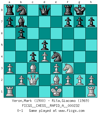 Last move : 0-1 2019 February 25 5:57:45 [Event "FICGS__CHESS__RAPID_A__000232"] [Site "FICGS"] [Date "2019.02.09"] [Round "1"] [White "Veron,Mark"] [Black "Rita,Giacomo"] [Result "0-1"] [WhiteElo "1900"] [BlackElo "1969"] 1.d4 Nf6 2.c4 e6 3.Nc3 Bb4 4.Nf3 b6 5.Bd2 O-O 6.Qc2 Bb7 7.e3 d5 8.cxd5 exd5 9.Bd3 c5 10.a3 Bxc3 11.Bxc3 c4 12.Be2 Ne4 0-1 Nimzo-Indian : Three knights variation Kingside Castling by player Black (move 5) Player Black won this chess game. Follow this game move after move (download)Life is like a game of Chess, changing with each move. (Chinese proverb) Schach ist ein Reich, wo sich die menschliche Phantasie frei entfalten kann. (David Bronstein) Fischer es el jugador mas fuerte del mundo. De hecho, el jugador mas fuerte que jamas haya existido. (Larry Evans) Echiquier : carré parfait, comme la Jérusalem nouvelle décrite par l'auteur de l'Apocalypse, huit cases sur huit, exaltation du chiffre 4, symbole du cosmos aux quatre horizons... où le noir et le blanc, l'ombre et la lumière, le mal et le bien s'entremêlent et se conjuguent. (Robert Couffignal, Le Gambit du poète) . 'gn is not allowed in chess unless n is an integer between 1 and 8 inclusive, where 1 and 8 are to interpreted as the standard numerals standing for integers in the ordered real-closed field R, with the *canonical* ordering. (As opposed to, say, an integer in the domain Z[2+i*sqrt(5)] or an integer in some exotic Grothendieck topos). (Normajean Yates)