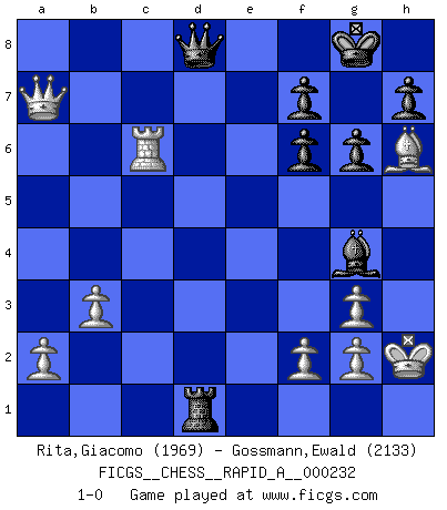 Last move : 1-0 2019 March 23 19:53:45 [Event "FICGS__CHESS__RAPID_A__000232"] [Site "FICGS"] [Date "2019.02.09"] [Round "1"] [White "Rita,Giacomo"] [Black "Gossmann,Ewald"] [Result "1-0"] [WhiteElo "1969"] [BlackElo "2133"] 1.e4 c6 2.d4 d5 3.Nc3 dxe4 4.Nxe4 Nf6 5.Nxf6+ exf6 6.c3 Bd6 7.Bd3 O-O 8.Ne2 Re8 9.O-O c5 10.Be3 Qc7 11.Ng3 g6 12.Re1 Be6 13.Qf3 Nd7 14.Bh6 cxd4 15.cxd4 Bxg3 16.hxg3 Qd6 17.Be4 Qxd4 18.Bxb7 Rab8 19.b3 Bg4 20.Qd5 Qb6 21.Rxe8+ Rxe8 22.Bc6 Rd8 23.Qd6 Qb8 24.Qe7 Re8 25.Qa3 Rd8 26.Rc1 Ne5 27.Qe7 Nxc6 28.Rxc6 Rd1+ 29.Kh2 Qd8 30.Qxa7 1-0 Caro-Kann : Tartakower (Nimzovich) variation Kingside Castling by player Black (move 7) Kingside Castling by player White (move 9) Player White won this chess game. Follow this game move after move (download)There just isn't enough televised Chess. (David Letterman) Drei Punkte vor allen anderen ist wie einer, der im weißen Anzug posiert, während der Rest in Müllsäcke gekleidet dasteht. (Viktor Kortschnoi) Siempre es mejor sacrificar los hombres de tu oponente. (Savielly Tartakower) Le plus grand jeu de l'esprit jamais inventé, plus vous l'apprenez, plus vous y prenez du plaisir. (Garry Kasparov) Thibault, I ask for draw. Game 13876. - Sorry Ilmars, you won. (FICGS chat)