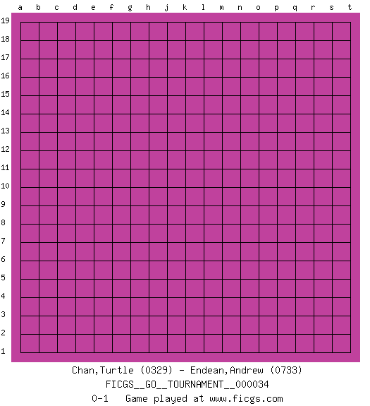 Last move : 0-1 2019 March 11 22:49:8 [Event "FICGS__GO__TOURNAMENT__000034"] [Site "FICGS"] [Date "2019.02.09"] [Round "1"] [Black "Chan,Turtle"] [White "Endean,Andrew"] [Result "0-1"] [Rating 1 "0329"] [Rating 2 "0733"] 0-1 This go game has been lost on time (started : 2019.02.09 17:55:51) Here are the names of the openings (joseki) played in the four corners : Player White won this Go (weiqi, baduk) game. Follow this game move after move (download)Learn to play under the stones. (Anonymous) Control your own destiny or someone else will. (Jack Welch)