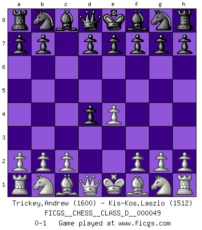 Last move : 0-1 2007 July 12 4:42:56 [Event "FICGS__CHESS__CLASS_D__000049"] [Site "FICGS"] [Date "2007.06.01"] [Round "1"] [White "Trickey,Andrew"] [Black "Kis-Kos,Laszlo"] [Result "0-1"] [WhiteElo "1600"] [BlackElo "1512"] 1.e4 c5 2.d4 cxd4 0-1 This chess game has been lost on time (started : 2007.06.01 11:17:28) Sicilian : Smith-Morra gambit Player Black won this chess game. Follow this game move after move (download)Capture of the adverse King is the ultimate but not the first object of the game. (William Steinitz) Schach ist Krieg, im Schach geht es um testosterongesteuerte Urschreie. (Garry Kasparov) Del Ajedrez se ha dicho que la vida no es lo suficientemente larga para él, pero eso es culpa de la vida, no del Ajedrez. (William Ewart Napier) Il a essayé de se convaincre qu'il pourrait empêcher toutes les erreurs et ne jamais perdre. L'horreur ! Gary Kasparov au sujet de Robert Fischer. Good decisions come from experience, and experience comes from bad decisions. (Anonymous)