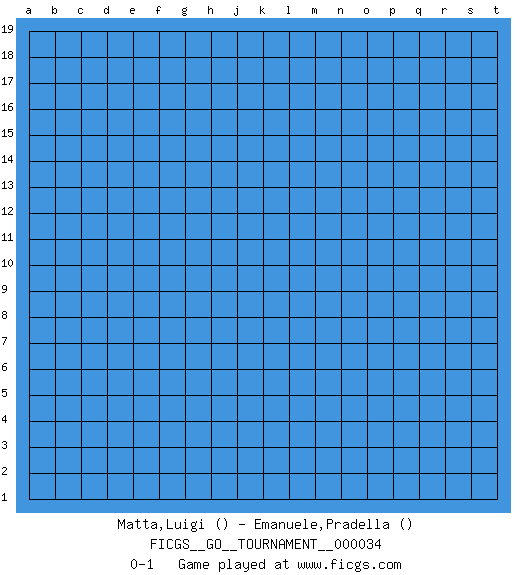 Last move : 0-1 2019 March 11 22:49:8 [Event "FICGS__GO__TOURNAMENT__000034"] [Site "FICGS"] [Date "2019.02.09"] [Round "1"] [Black "Matta,Luigi"] [White "Emanuele,Pradella"] [Result "0-1"] 0-1 This go game has been lost on time (started : 2019.02.09 17:55:51) Here are the names of the openings (joseki) played in the four corners : Player White won this Go (weiqi, baduk) game. Follow this game move after move (download)Fighting must not be the key to go, it should be reserved as your last resource. (Zhong-Pu Liu, about Weiqi) Whoever said the pen is mightier than the sword obviously never encountered automatic weapons. (US General Douglas MacArthur)