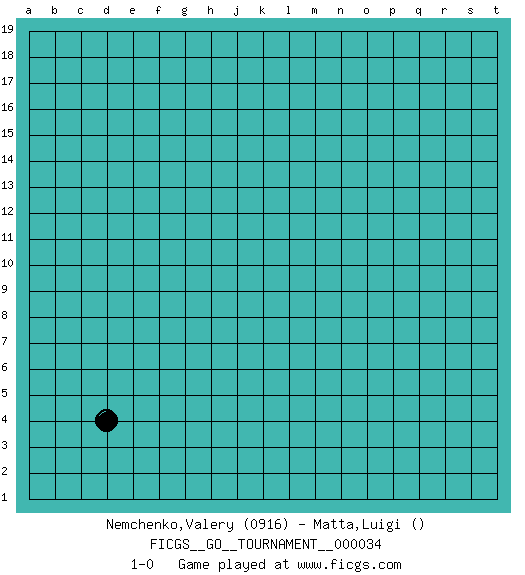 Last move : 1-0 2019 March 11 22:49:8 [Event "FICGS__GO__TOURNAMENT__000034"] [Site "FICGS"] [Date "2019.02.09"] [Round "1"] [Black "Nemchenko,Valery"] [White "Matta,Luigi"] [Result "1-0"] [Rating 1 "0916"] 1.d4 1-0 This go game has been lost on time (started : 2019.02.09 17:55:51) Here are the names of the openings (joseki) played in the four corners : Corner d4 : d4 1-0 Hoshi (Hwajeom, Seongjeom, Xingwei`) 4-4 Point. The star or hoshi (4-4) point, emphasizing influence at the potential expense of territory. Player Black won this Go (weiqi, baduk) game. Follow this game move after move (download)Connect with good shape. (Anonymous) Computer Science is no more about computers than astronomy is about telescopes. (Edsger W. Dijkstra)