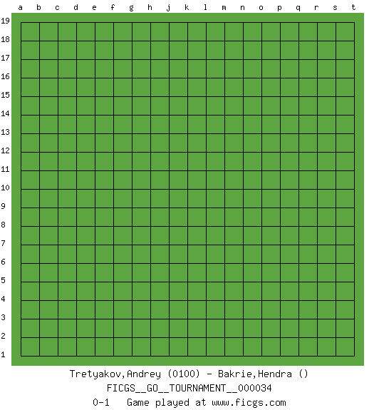 Last move : 0-1 2019 March 11 22:49:8 [Event "FICGS__GO__TOURNAMENT__000034"] [Site "FICGS"] [Date "2019.02.09"] [Round "1"] [Black "Tretyakov,Andrey"] [White "Bakrie,Hendra"] [Result "0-1"] [Rating 1 "0100"] 0-1 This go game has been lost on time (started : 2019.02.09 17:55:51) Here are the names of the openings (joseki) played in the four corners : Player White won this Go (weiqi, baduk) game. Follow this game move after move (download)Extend one hand from the cutting points. (Anonymous) Inventor: A person who makes an ingenious arrangement of wheels, levers and springs, and believes it civilization. (Ambrose Bierce, The Devil's Dictionary)