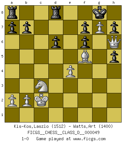 Last move : 1-0 2007 July 1 20:41:53 [Event "FICGS__CHESS__CLASS_D__000049"] [Site "FICGS"] [Date "2007.06.01"] [Round "1"] [White "Kis-Kos,Laszlo"] [Black "Watts,Art"] [Result "1-0"] [WhiteElo "1512"] [BlackElo "1400"] 1.e4 c5 2.Nf3 d6 3.d4 cxd4 4.Nxd4 Nf6 5.Nc3 g6 6.Be3 Bg7 7.f3 O-O 8.Qd2 Nc6 9.O-O-O Bd7 10.g4 Rc8 11.h4 Ne5 12.Kb1 Qc7 13.h5 Nxf3 14.Nxf3 Bxg4 15.h6 Bxf3 16.hxg7 Rfd8 17.Bh3 Ra8 18.Bg5 Bxd1 19.Bxf6 Bxc2+ 20.Kxc2 exf6 21.Qh6 Qc5 22.Bd7 Qh5 23.Rxh5 gxh5 24.Bf5 1-0 Sicilian : Dragon, Yugoslav attack, 7...O-O Kingside Castling by player Black (move 7) Queenside Castling by player White (move 9) Player White won this chess game. Follow this game move after move (download)If your opponent cannot do anything active, then don't rush the position; instead you should let him sit there, suffer, and beg you for a draw. (Jeremy Silman) Meine Liebe ist Schach, Schach, Schach. Ich muss jeden Tag Schach spielen, deshalb fühle ich mich so stark. (Miguel Najdorf) No soy una persona materialista y por eso, no resiento la falta o pérdida del dinero. La ausencia de cosas mundanas carece de importancia. Ya que el Ajedrez es una forma en la que puedo ser tan materialista como yo desee sin tener la necesidad de vender mi alma. (Jamie Walter Adams) Pour se monter efficace, un Cavalier a besoin d'avant-postes ! Les Cavaliers font les meilleurs bloqueurs de pions passés. When a man with money meets a man with experience, the man with experience leaves with money and the man with money leaves with experience. (Anonymous)