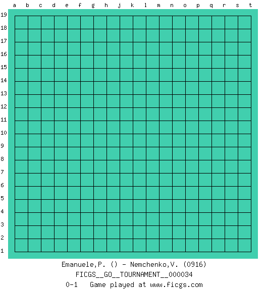 Last move : 0-1 2019 March 11 22:49:8 [Event "FICGS__GO__TOURNAMENT__000034"] [Site "FICGS"] [Date "2019.02.09"] [Round "1"] [Black "Emanuele,Pradella"] [White "Nemchenko,Valery"] [Result "0-1"] [Rating 2 "0916"] 0-1 This go game has been lost on time (started : 2019.02.09 17:55:51) Here are the names of the openings (joseki) played in the four corners : Player White won this Go (weiqi, baduk) game. Follow this game move after move (download)If you cannot succeed, then die gloriously. (Chinese proverb) Two beer, or not two beer. (Unknown)