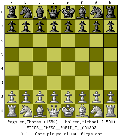 Last move : 0-1 2019 March 11 22:49:8 [Event "FICGS__CHESS__RAPID_C__000203"] [Site "FICGS"] [Date "2019.02.09"] [Round "1"] [White "Regnier,Thomas"] [Black "Holzer,Michael"] [Result "0-1"] [WhiteElo "1584"] [BlackElo "1500"] 0-1 This chess game has been lost on time (started : 2019.02.09 21:22:8) Player Black won this chess game. Follow this game move after move (download)The game of Chess is not merely an idle amusement; several very valuable qualities of the mind are to be acquired and strengthened by it, so as to become habits ready on all occasions; for life is a kind of Chess. (Benjamin Franklin) Ich bin stolz ein Bulgare zu sein. (Veselin Topalov) Una de estas pequeñas movidas modestas pudieran ser mas molestas a tu oponente que la amenaza mas grande. (Siegbert Tarrasch) Le système Elo représente seulement une moyenne. Il est simplement un indicateur de votre stabilité. (Anatoli Karpov) The good fighters of old first put themselves beyond the possibility of defeat, and then waited for an opportunity of defeating the enemy. (Sun Tzu)