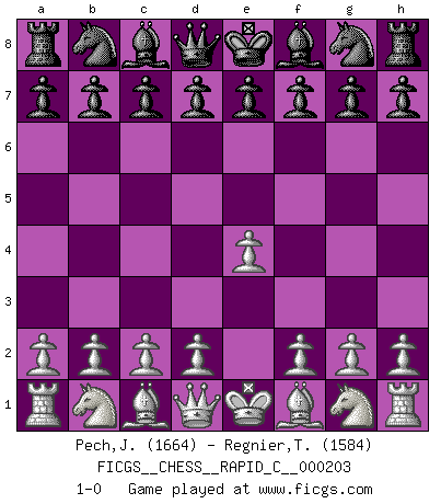 Last move : 1-0 2019 March 12 22:58:24 [Event "FICGS__CHESS__RAPID_C__000203"] [Site "FICGS"] [Date "2019.02.09"] [Round "1"] [White "Pech,Jaroslav senior"] [Black "Regnier,Thomas"] [Result "1-0"] [WhiteElo "1664"] [BlackElo "1584"] 1.e4 1-0 This chess game has been lost on time (started : 2019.02.09 21:22:8) King's pawn Opening Player White won this chess game. Follow this game move after move (download)It is difficult to play against Einstein's theory --on his first loss to Fischer. (Mikhail Tal) Der Schachmeister von Heute braucht Courage, einen Killerinstinkt, Ausdauer und Arroganz. (Larry Evans) Por la belleza de sus partidas, la claridad de su juego y lo brillante de sus ideas, Fischer se creó el mismo como un artista de la misma estatura como Brahms, Rembrandt y Shakespeare. (David Levy) Ce n'est pas pour s'amuser qu'il joue aux échecs : il célèbre un culte. (Vladimir Nabokov) If you ain't just a little scared when you enter a casino, you are either very rich or you haven't studied the games enough. (Pappy)