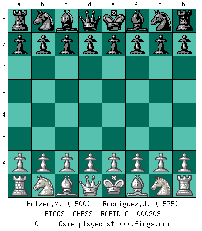 Last move : 0-1 2019 March 11 22:49:8 [Event "FICGS__CHESS__RAPID_C__000203"] [Site "FICGS"] [Date "2019.02.09"] [Round "1"] [White "Holzer,Michael"] [Black "Rodriguez,Juan Antonio"] [Result "0-1"] [WhiteElo "1500"] [BlackElo "1575"] 0-1 This chess game has been lost on time (started : 2019.02.09 21:22:8) Player Black won this chess game. Follow this game move after move (download)In Chess, just as in life, today's bliss may be tomorrow's poison. (Assaic) Ich verachte die Medien. (Robert James Fischer) En manos de Fischer's, una diminuta ventaja teórica es tan buena como tener una Reina de ventaja. (Isaac Kashdan) Votre prénom est 'Tactique', votre deuxième prénom est 'Tactique' et votre nom est 'Tactique'. (Ken Smith) We're missing something. (Gregory House, House M.D.)